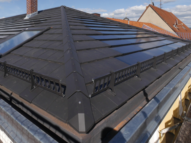 Die Umsetzung erfolgte in enger Zusammenarbeit mit dem Bayerischen Landesamt für Denkmalpflege und der städtischen Denkmalbehörde Bamberg, die hohe Anforderungen an Eingriffe in die historische Gebäudesubstanz stellen. Der Bischberger Handwerksbetrieb Dach&Holzbau Steck, der sich mit großer Zuverlässigkeit erstmals an diese besondere Form der Dachdeckung herangewagt hat, realisierte das Projekt. Mit viel Sorgfalt und Engagement ist es gelungen, ein Ergebnis zu erzielen, das den denkmalpflegerischen Vorgaben ebenso gerecht wird wie den technischen Anforderungen der Solartechnik.