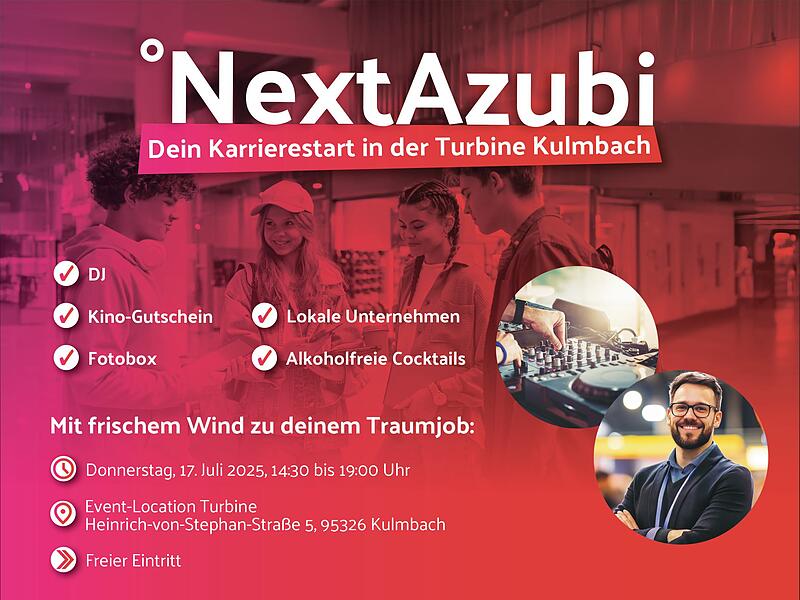 Die Veranstaltung startet um 14.30 Uhr, endet um 19 Uhr und steigt in einer modernen Event-Location, der Turbine Kulmbach. Weshalb die NextAzubi etwas ganz Besonderes ist? Die Veranstalter schaffen bewusst eine lockere Atmosphäre, die exakt zu ihren jungen Besucherinnen und Besuchern passt - dich erwarten ein DJ, eine Fotobox, alkoholfreie Cocktails, verschiedene Vorträge und eine Chillout-Area.
