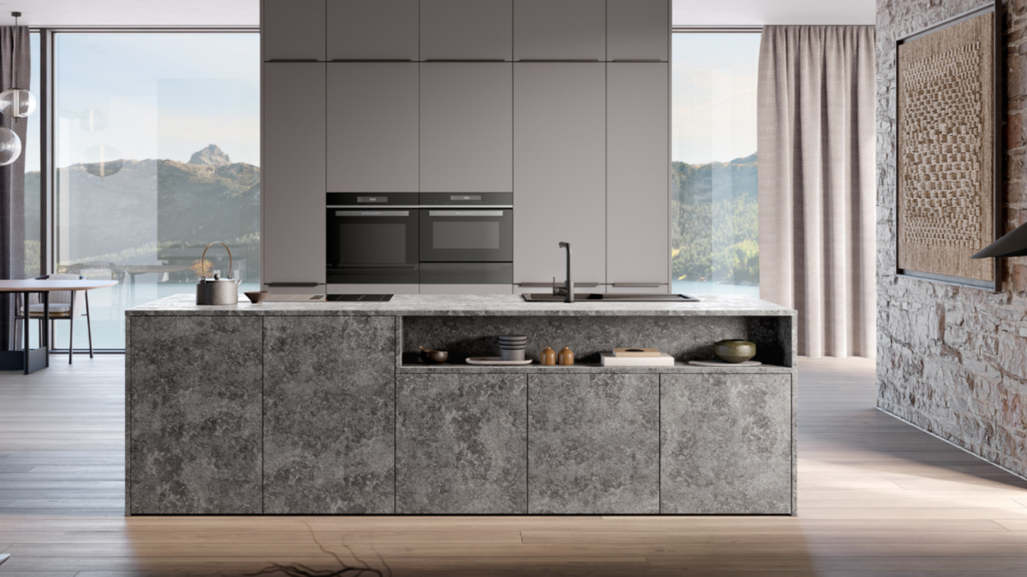 - Arbeitsplatten in Stein-, Zement- und Granit-Optik: Natürliche Oberflächen mit moderner, hochwertiger Ausstrahlung lösen den klassischen Beton-Look ab und bringen mehr Wärme in die Küche.