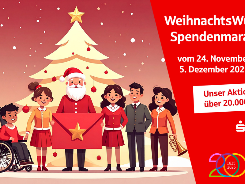 Gemeinsam mit Ihnen möchte die Sparkasse Bamberg mit Hilfe von regionalen Vereinen gemeinnützigen Zwecken eine Freude zu Weihnachten bescheren. Hierfür wurde der WeihnachtsWunder-Spendenmarathon ins Leben gerufen. Passend zum 200-jährigen Jubiläum steht hierfür ein Aktionsbudget von 20.000 Euro bereit - und somit 10.000 Euro mehr gegenüber der Voraktion! Vereine können sich durch Spenden ihren Anteil am Aktionstopf sichern. Je größer der Anteil, desto größer das Stück vom Kuchen!