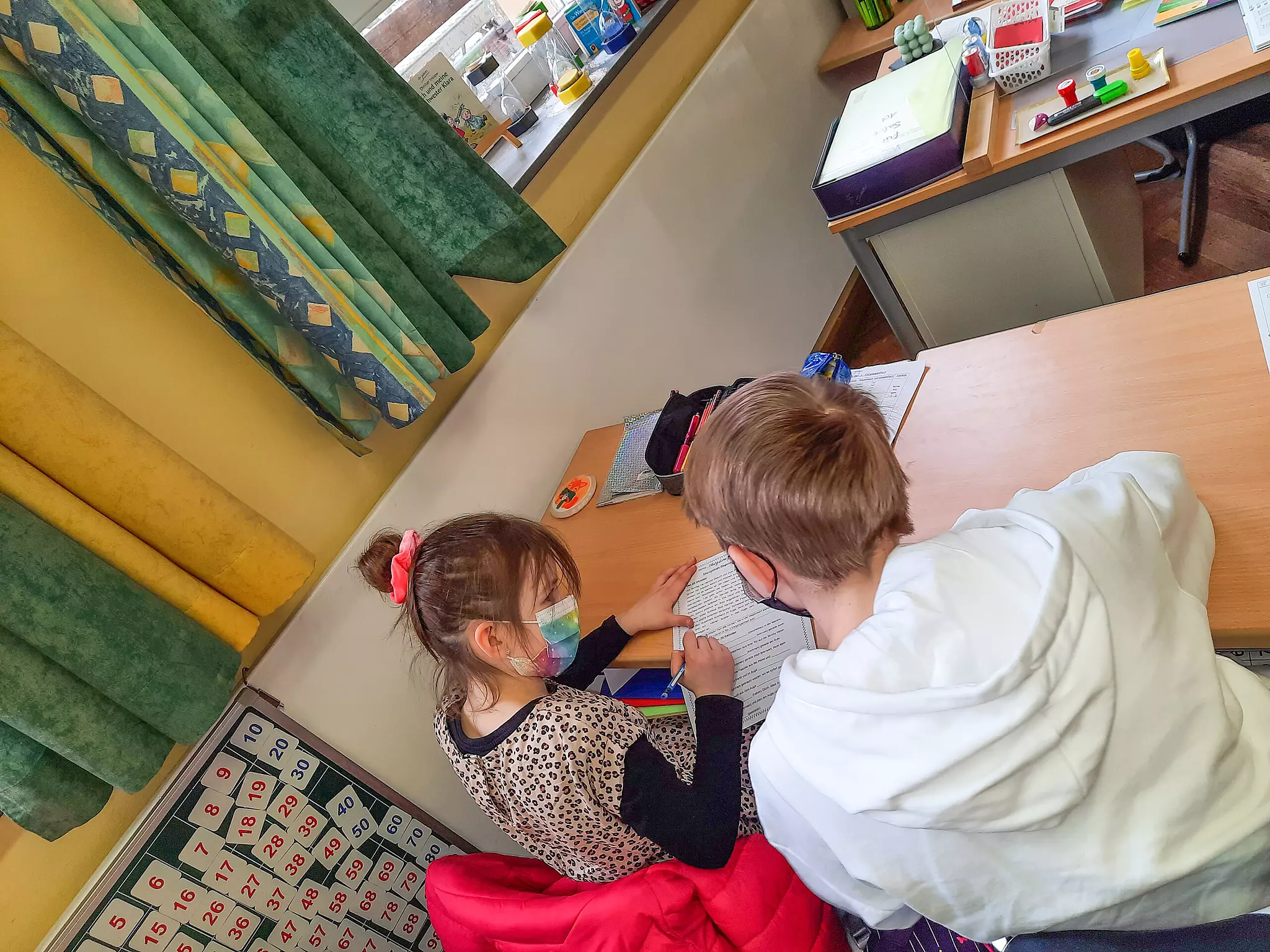 Zusammenarbeit Schüler gemeinsam gegen Coronalücken Evgenia (links) macht zusammen mit ihrem Nachhilfelehrer Artjom Hausaufgaben. // Kerstin Schmitz von KLARTEXT!-Schüler*innen Fränkischer Tag TEILEN  14.06.2022 Bamberg – Ein neuartiges Projekt gibt es zwischen der Erlöser-Mittelschule und der Rupprecht-Grundschule Bamberg. Bei "Schüler helfen Schülern" unterstützen Mittelschüler Kinder der Grundschule dabei, Lerndefizite zu beheben. Im Lockdown zu Hause zu sitzen und allein mit dem Schulstoff klarzukommen war für keinen Schüler leicht. Aber wie schwierig muss es gewesen sein, wenn man gerade erst in die Schule gekommen ist und das Lesen, Schreiben und Rechnen noch gar nicht kann? Wenn man außerdem kein eigenes Zimmer hat, in dem man in Ruhe lernen kann, es keinen Computer zu Hause gibt und die Eltern nicht helfen können, weil sie selbst wenig oder gar nicht Deutsch sprechen? Probleme, den Stoff zu verstehen So haben es viele Grundschüler der Rupprechtschule in Bamberg erlebt und deshalb nun Probleme, den Unterrichtsstoff zu verstehen. Aus diesem Grund entwickelte Beratungslehrerin Kerstin Schmitz das Projekt "Schüler helfen Schülern". Viele von uns Mittelschülern, die dabei mitmachen, haben Deutsch auch erst in der Grundschule gelernt und wissen gut, wie schwer der Unterricht ist, wenn man noch nicht alles versteht. Das war einer der Gründe, warum wir bei dem Projekt, das zwischen Februar und Juni 2022 stattfindet, mitmachen wollten. Zur Finanzierung unseres Nachhilfelohnes hat unser Schulleiter Eugen Kügler Sponsoren gesucht und gefunden, so dass wir mit unserem Engagement auch ein bisschen unser Taschengeld aufbessern können. Erklärungen in der Muttersprache 15 Jungen und Mädchen der 7. und 8. Klassen der Erlöserschule treffen sich ein- bis zweimal pro Woche mit jeweils den gleichen Grundschülern und helfen bei den Hausaufgaben oder wiederholen gemeinsam den Unterrichtsstoff. "Wenn wir die gleiche Muttersprache wie die Kinder haben, erklären wir manchmal auch etwas in Russisch, Türkisch, Arabisch, Griechisch oder Englisch. Oft hilft es, etwas zu übersetzen und dann können die Kinder gut weiterarbeiten", erklärt Lewis (14). Grundschüler verbessern sich Für die Grundschüler ist es toll, einen älteren Nachhilfelehrer zu haben, der sich nur für sie Zeit nimmt und sie verbessern sich. "Es hilft mir sehr, wenn mir Rana die Aufgaben, die ich im Unterricht nicht verstehe, auf Türkisch erklärt", erzählt Mert (10). Sona (9) war oft unglücklich, weil er seine Hausaufgaben aufgrund von Sprachschwierigkeiten nicht machen konnte. "Jetzt bin ich froh, dass ich wenigstens zweimal in der Woche alle meine Hausaufgaben machen kann, weil Firuze mir hilft", so der Grundschüler. Auch für uns ist es ein schönes Gefühl, den Kindern weiterzuhelfen. "Ich erinnere mich noch gut daran, wie es in der Grundschule war, als ich noch kein Deutsch konnte", berichtet Mariam (16). "Auch ich habe mir mit den Hausaufgaben schwergetan. Jetzt helfe ich Bahar und wenn wir fertig sind, lernen wir noch etwas zusammen, lesen oder spielen." Bis Juni - so lange ist das Projekt finanziert - werden wir uns noch mit den Grundschülern treffen und ihnen beim Lernen helfen. Vielleicht könnt ihr das an eurer Schule auch machen? Engagieren sich beim Projekt: Jugendliche der Erlöser-Mittelschule // Kerstin Schmitz von Schülern der Erlöser-Mittelschule und Kerstin Schmitz