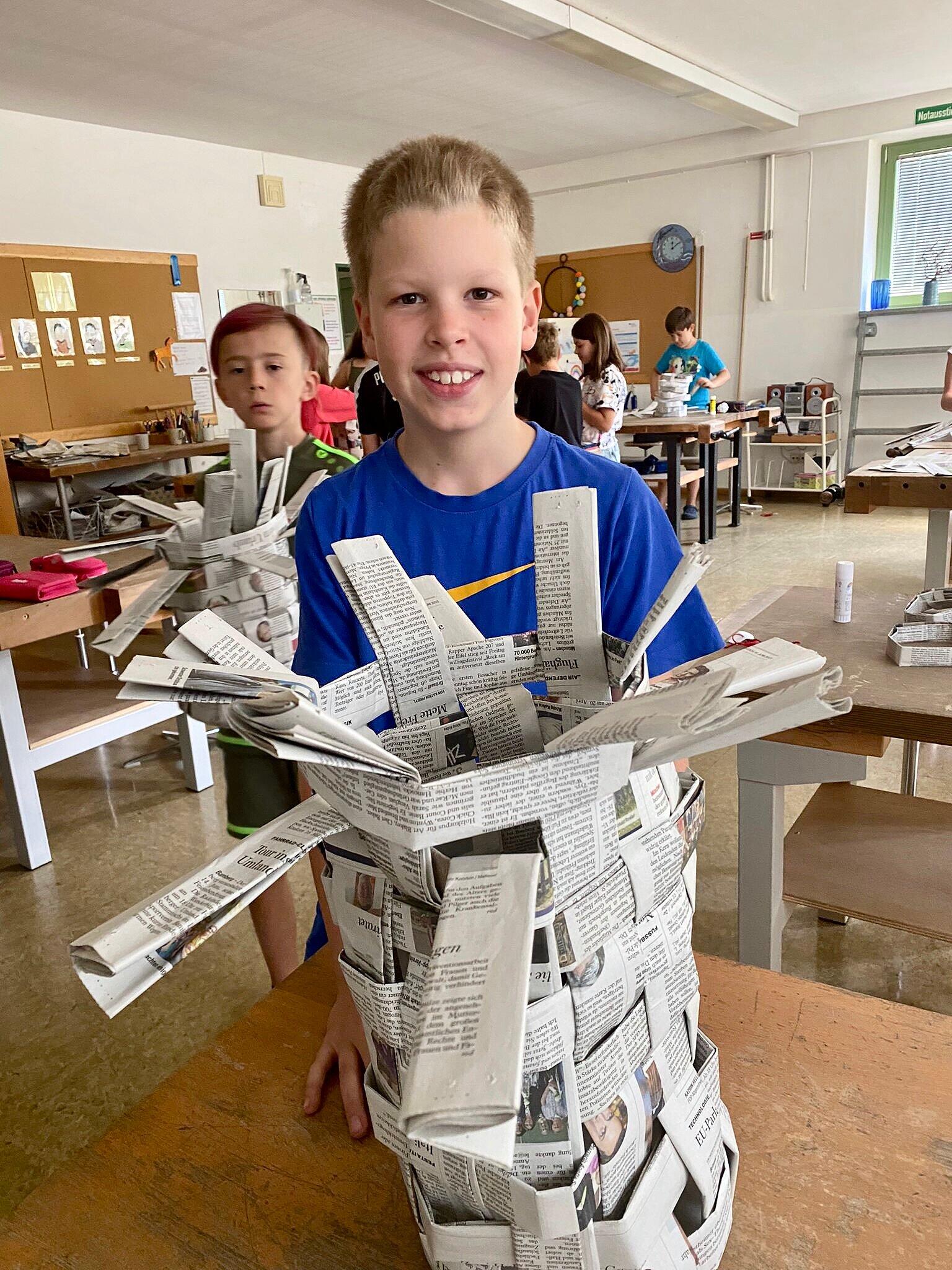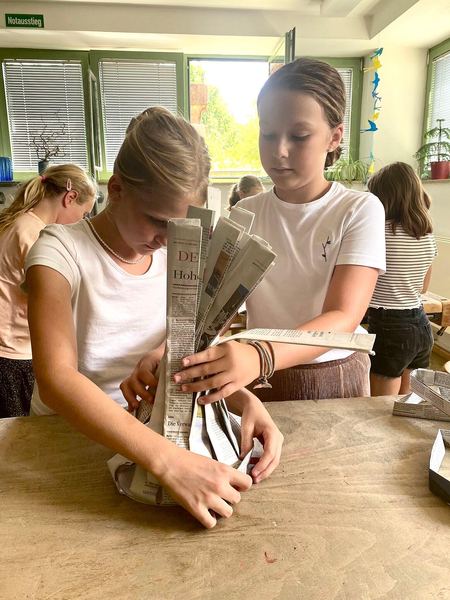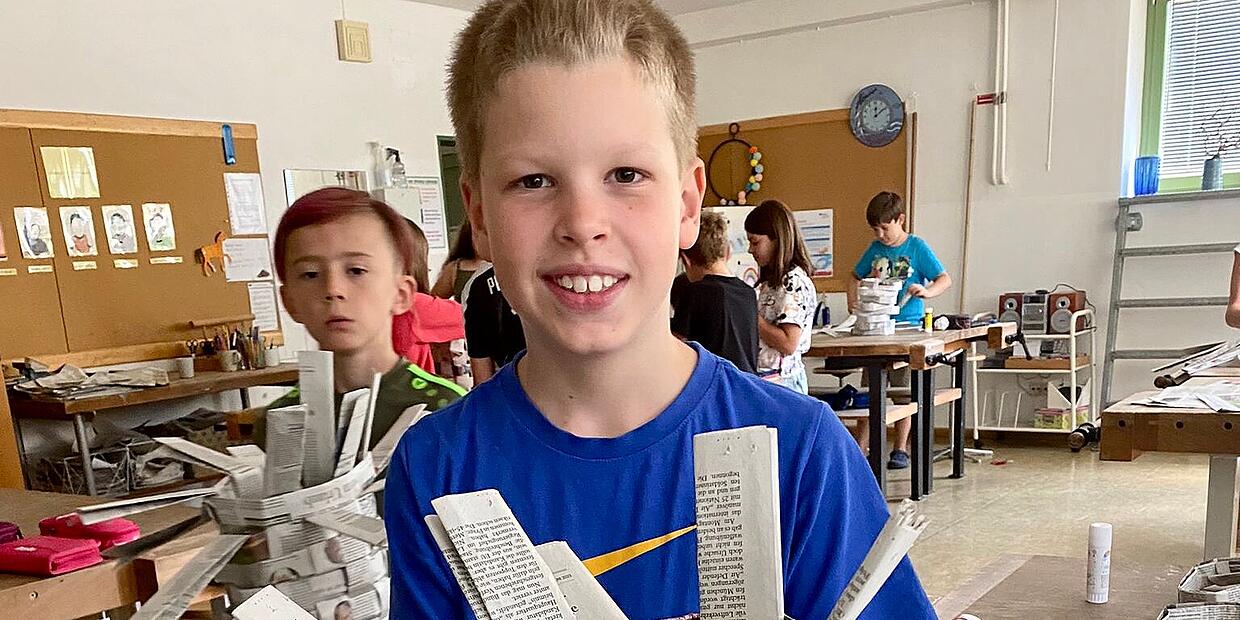 Bastelaktion Flechtkunst mit der Zeitung Grundschüler aus Vierreth-Trunstadt stellen Körbe aus gelesenen Zeitungen her. // privat Grundschüler aus Vierreth-Trunstadt stellen Körbe aus gelesenen Zeitungen her. // privat Grundschüler aus Vierreth-Trunstadt stellen Körbe aus gelesenen Zeitungen her. // privat von Matthias Decker Fränkischer Tag TEILEN  25.07.2023 Viereth-Trunstadt – Die Viertklässler aus Viereth-Trunstadt im Landkreis Bamberg flochten nach „KLARTEXT!“, dem Schulprojekt des Fränkischen Tags, Körbe aus gelesenen Zeitungen. Mehrere Wochen war die Tageszeitung für die Schülerinnen und Schüler verfügbar, wobei nicht nur das genaue Lesen vor und während des Unterrichts geübt werden konnte. Besonders die Vielfalt der Themen boten Anlass für animierende Klassengespräche. Doch damit nicht genug. Dass eine gelesene Zeitung nicht weggeworfen werden muss, bewies die Zusammenarbeit mit der engagierten Lehrkraft für „Werken und Gestalten“. In Form von geflochtenen Aufbewahrungskörben wurden die Zeitungen am Ende in neuem Glanz und mit neuer Funktion stolz präsentiert. „Gut, dass wir den FT zu Hause haben“, meinte eine Schülerin, die in den Sommerferien weitere multifunktionale Körbe herstellen möchte.