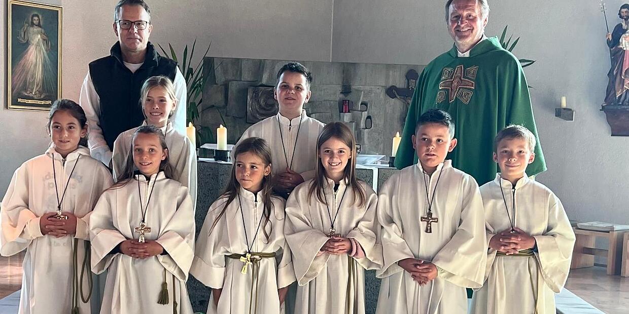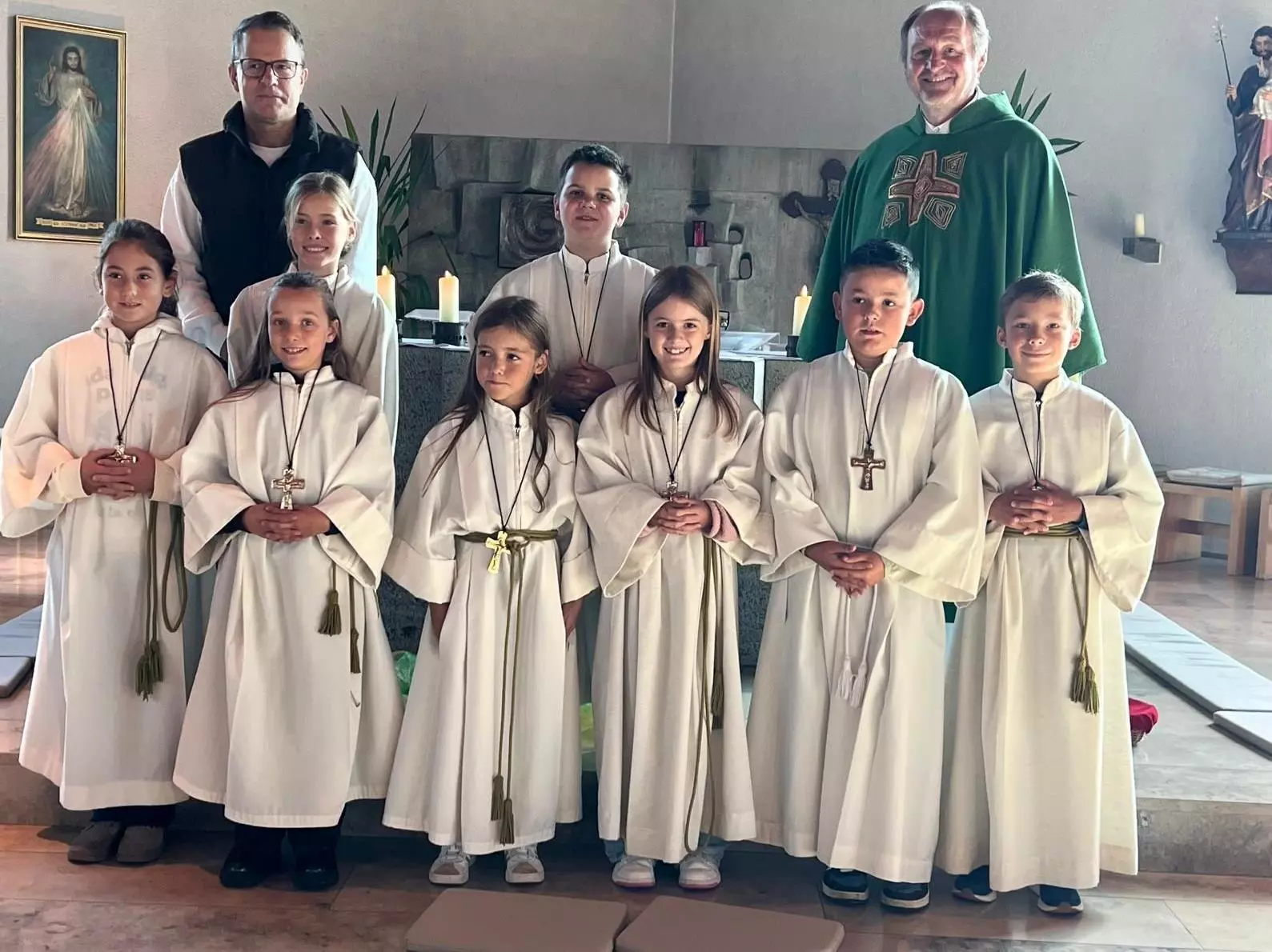 Diebach Bereit für den Dienst: So viele neue Minis gab es noch nie Auf dem Bild zu sehen sind von links: Emmi Schärpf, Heiko Schmitt (Sozialpädagoge), unten. Carlotta Looke, oben: Rosa Schaub, Mathilda Feser, Max Betz, Johanna Stockmann, Leander Hohmann, Pfarrer Paul Kowol und Leo Kraft. // Margarete Horowska TEILEN  vor 1 Stunde Diebach Am Sonntag 28. September, war es endlich soweit. Acht neue Ministrantinnen und Ministranten wurden im Rahmen der feierlichen Messe in ihren Dienst am Altar eingeführt und in die Gemeinschaft der Ministrantinnen und Ministranten der Pfarrei St. Georg in Diebach (Pfarreiengemeinschaft „Am Sturmiusberg“/Pastoraler Raum Hammelburg) aufgenommen. In der gut gefüllten Kirche stellte Pfarrer Paul Kowol zunächst die neuen Minis der Gemeinde vor. Danach legten die Neuen gemeinsam ihr Ministrantenversprechen ab und bekamen schließlich ihr zuvor gesegnetes Kreuz umgehängt. Pfarrer Kowol betonte, dass der Dienst am Altar, ganz nahe bei Gott, ein wichtiger Dienst für Gott und die Gemeinde sei. Er wies darauf hin, dass in diesem Jahr das erste Mal in Diebach gleich acht Erstkommunionkinder in diesen wichtigen Dienst aufgenommen werden. So war Pfarrer Kowol und allen Anwesenden die große Freude darüber deutlich anzumerken, heißt es in der Mitteilung weiter. Bevor die neuen Minis die Fürbitten vortrugen, überreichte Sozialpädagoge Heiko Schmitt noch die Ministrantentasse mit der Aufschrift: „Ich gehöre zu Gottes Bodenpersonal“. Er zeigte sich davon überzeugt, dass sich neben der Gemeinde in Diebach vor allem der liebe Gott über ein junges, sympathisches und lebendiges Bodenpersonal ganz besonders freue.Die Familien der Ministranten und Ministrantinnen und Gemeindemitglieder verweilten nach dem feierlichen Auszug noch etwas vor der Kirche, um die Neuen zu beglückwünschen. Da strahlten nicht nur die Minis, sondern, passend zum freudigen Ereignis, auch die Sonne. red