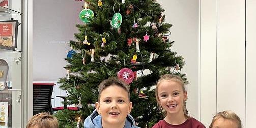 Ein Kinderteam verwandelt den Weihnachtsbaum in der Sparkasse Bad Brückenau in ein Highlight.