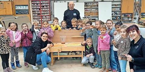 Schon im Vorfeld hatten sich die Kinder im Kindergarten mit dem Beruf des Schreiners beschäftigt. Sie wussten bereits, dass Schreiner mit Holz arbeiten, Möbel herstellen und viele verschiedene Werkzeuge und Maschinen benutzen. Umso spannender war es für die Kinder, nun eine echte Werkstatt zu erleben. Zu Beginn führte Benjamin Back die Kinder bei einem kleinen Rundgang durch seine Schreinerei. Dabei zeigte er ihnen verschiedene Arbeitsbereiche und erklärte kindgerecht einige der Maschinen und Werkzeuge, die ein Schreiner täglich benutzt. Die Kinder hörten aufmerksam zu und stellten viele neugierige Fragen.