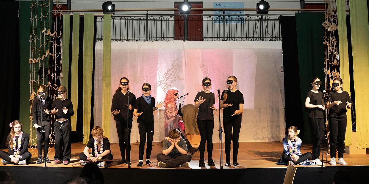 Ein wesentlicher Teil des Abenteuers bestand aber darin, die anspruchsvolle Musik zu präsentieren, was in einer Schulaufführung mit allen Kindern einer 5. Klasse nie fehlerfrei gelingen kann. Dieser gewaltigen Herausforderung stellte sich einerseits das 17-köpfige Musicalorchester mit seiner einfühlsamen und flexiblen Interpretation der Songs. Vor allem aber auch die Theaterklasse 5d, die voller Begeisterung und den passenden Moves die schwierigen Lieder vortrug. Für wahre Gänsehautmomente sorgten zudem die verschiedenen Solistinnen und Solisten.