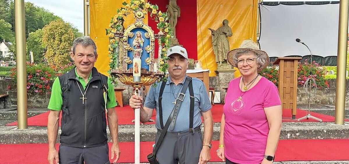 Retzbachwallfahrt Schönes Gemeinschaftserlebnis Auch viele neue Pilger kamen heuer dazu. // Katharina Volkmuth von Hilmar Ruppert TEILEN  12.10.2025 Sulzthal Rund 60 Wallfahrerinnen und Wallfahrer machten sich um 5.30 Uhr in Sulzthal, noch bei Dunkelheit, auf den Pilgerweg zur Wallfahrtskirche „Maria im Grünen Tal“ in Retzbach. Musikalisch begleitet wurden sie von der örtlichen Musikkapelle und einigen Musikerkollegen, die sich gerne ins Musikteam einbrachten. Das Organisationsteam der Wallfahrt konnte sich auch in diesem Jahr freuen, dass sowohl bei der Musikkapelle als auch bei den Wallfahrern neue Musiker und Pilger erstmals an der Wallfahrt teilgenommen haben. Zudem wurde wieder eine Buswallfahrt nach Retzbach angeboten, die gerne von den Sulzthalern und Einwohnern der Nachbardörfer angenommen wurde. Auch eine Gruppe von sieben E-Bikern und drei Fahrradfahrern machte sich auf den Weg nach Retzbach.Auf dem knapp 40 Kilometer langen Fußweg wurden die Pilger von drei Begleitfahrzeugen unterstützt, die neben dem Transport des Gepäcks, der Fahnen, der Instrumente, gekühlten Getränken auch eine Mitfahrgelegenheit für Personen anboten, die auf dem langen Fußweg eine Pause brauchten. Das Organisationsteam zeigte sich erleichtert, auch hier wieder auf die tatkräftige und zuverlässige Mitarbeit der Begleiter zählen zu können. Verschiedene BeweggründeUnterschiedlichste Beweggründe motivierten die Wallfahrerinnen und Wallfahrer, die lange Wegstrecke auf sich zu nehmen: Gebete und Gesang, persönliche Anliegen, sportliche Aktivität sowie Gespräche und Begegnungen ließen die Wallfahrt zu einem schönen Gemeinschaftserlebnis für Jung und Alt werden.Auch hatte der ein oder andere junge Mann schon mal die Ehre das Wallfahrtsbild ein Stück tragen zu dürfen, um Bildträger Erhard Tremer, der diese Aufgabe schon seit 45 Jahren inne hat, zu unterstützen. Für 25 Jahre Teilnahme an der Retzbach-Wallfahrt wurde Ludwig Edelmann im Gottesdienst am Sonntag früh geehrt und nahm stolz das von Pfarrer Wollbeck überreichte Pilgerkreuz entgegen. Im Anschluss machten die Wallfahrer sich wieder auf ihren Heimweg. Am Abend bei Einbruch der Dämmerung wurden Sie von Pfarrer Karl Feser und Ministranten, den Angehörigen und der Ortsbevölkerung in Sulzthal empfangen. Organisiert wurde die Wallfahrt im dritten Jahr gemeinschaftlich durch eine Organisationsgruppe die sich „Zukunft der Retzbachwallfahrt“ nennt. Und Zukunft hat die Retzbachwallfahrt in Sulzthal, wie man an der regen Teilnahme und an der positiven Resonanz der Zusammenkunft am Montag nach dem Dankgottesdienst sah. Das Ehrungsfoto zeigt (von links): Ludwig Edelmann (25. Teilnahme), Bildträger Erhard Tremer (45 Jahre dabei) und Susanne Müller vom Organisationsteam. // Johannes Halbig