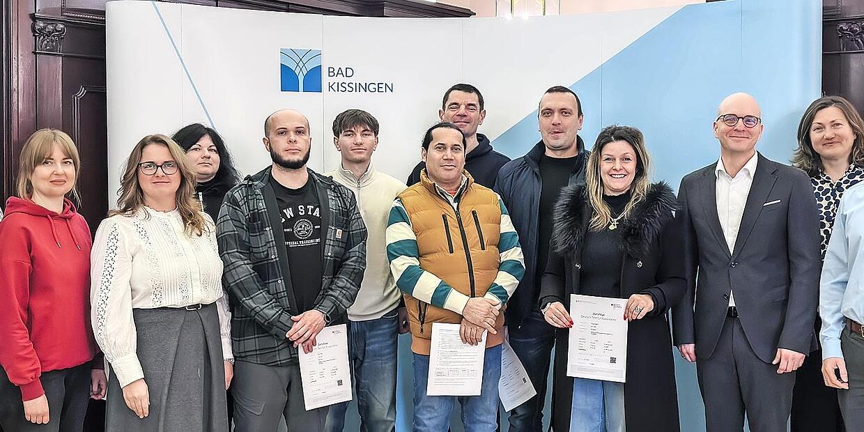 Oberbürgermeister Dirk Vogel überreichte im Sitzungssaal des Rathauses die Zertifikate. Er unterstrich die Bedeutung der Zusammenarbeit zwischen Volkshochschule, Jobcenter und Ausländerbehörde, damit Integration als gesellschaftliche und wirtschaftliche Aufgabe erfolgreich gelingt: „Ich möchte, dass wir in Bad Kissingen nicht nebeneinander leben, sondern gemeinsam lernen, arbeiten und leben. Dasein reicht nicht aus.“