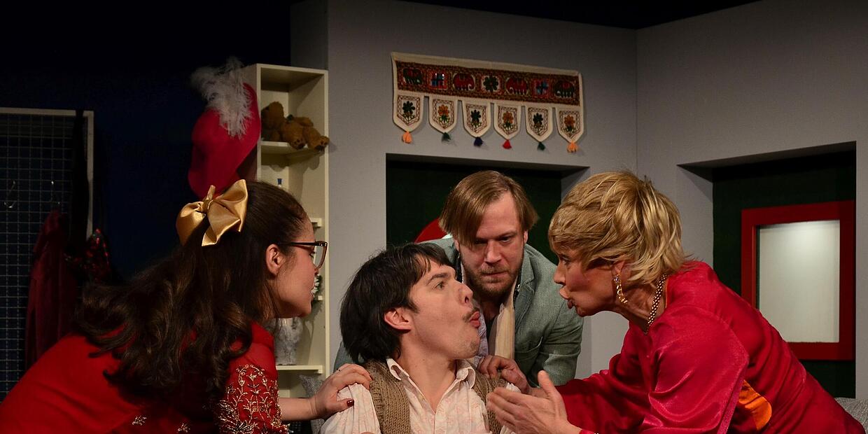 Auf der Bühne im Staatsbad Brückenau stehen vom Theater Schloss Maßbach: Anna Katharina Fleck, Inka Liad, Yannick Rey, Jonas Stüdemann. Regie führt Augustinus von Loë.