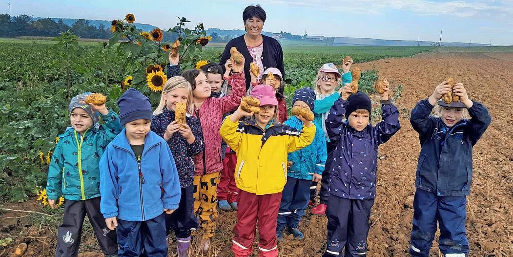 Kleine Erntehelfer Wer wird Kartoffelkönig? Die kleinen Erntehelfer aus dem Haus der Kinder in Ramsthal waren mit Ortsbäuerin Helene Greubel eifrig bei der Sache. // Andreas Lomb von Andreas Lomb TEILEN  12.10.2023 Ramsthal Obwohl die Kinder auf dem Land leben, bekommen sie oft wenig von der Landwirtschaft und den Ernten mit. Als noch fast jeder auf den Dörfern einen kleinen Acker bewirtschaftete, waren die Kinder bei der Kartoffelernte dabei. Heute glauben manche Kinder, dass die Kartoffeln aus dem Supermarkt kommen. Ortsbäuerin Helene Greubel lud daher die Kinder aus dem „Haus der Kinder“ in Ramsthal zur Ernte auf das Kartoffelfeld ein. Die Kinder hörten wissbegierig zu, als ihnen die Bäuerin einiges über die Kartoffel erzählte. Natürlich waren sie für die Ernte ausgerüstet und rückten mit Schaufeln, Eimer und Schubkarre aus. Auch mit den bloßen Händen machten sie sich auf die Suche nach den beliebten Knollen. Jeder wollte die größte Kartoffel erwischen und am Ende zum Kartoffelkönig gekrönt werden.Im Kindergarten wurde dann die Ernte an den nächsten Tagen genutzt, um einige Kartoffelgerichte zu kochen und zu verspeisen. Durch die Teilnahme an der Ernte hatten die Kinder einen besonderen Bezug zur Knolle und viel Spaß beim Zubereiten und Essen der Gerichte. hla