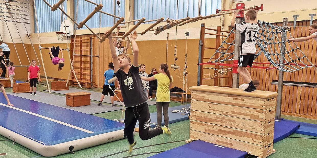 Am Nachmittag stehen zwei Stunden des Erlebnissports als TSV-Vereinsangebot an: eine Stunde für Kindergartenkinder und eine weitere für Schulkinder. Für beide Stunden müssen Eltern ihre Kinder inzwischen anmelden. Denn mehr als 30 Kinder sollen nicht gleichzeitig in der Halle sein, und die meisten der zurückliegenden Übungsstunden waren bis auf den letzten Platz ausgebucht.