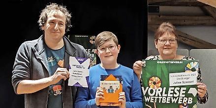Vorlesewettbewerb Stadt Julius Sponsel war der Beste Julius Sponsel vom Kaiser-Heinrich-Gymnasium freut sich: Er hat im Vorlesen gewonnen. Juryvorsitzender Christian Köstner und Büchereileitern Christiane Weiß gratulieren und wünschen viel Glück, denn Julius vertritt nun die Stadt Bamberg beim Bezirkswettbewerb für Oberfranken. // Stadtbücherei Bamberg TEILEN  06.03.2025 Bamberg In der Stadtbücherei Bamberg fand der Stadtentscheid des Vorlesewettbewerbs statt. Acht Schülerinnen und Schüler aus der sechsten Jahrgangsstufe der Bamberger Realschulen und Gymnasien haben im Saal der Stadtbücherei einen spannenden Wettbewerb um den Stadtsieg im Vorlesen ausgetragen. Die acht Lesebegeisterten hatten sich bereits im Dezember gegen ihre Mitschülerinnen und Mitschüler durchgesetzt und traten nun jeweils mit einem von ihnen selbst ausgewählten Kinderbuch an, aus dem sie dem Publikum und der fünfköpfigen Jury vorlasen.In der zweiten Runde galt es, aus einem unbekannten Kinderbuch vorzulesen. Mit dem von der Stadtbücherei ausgewählten „Rückwärtsdieb – Mehr als nur ein Trick“ von Ulrich Fasshauer zogen die Vorlesenden ihr Publikum in ihren Bann. Die witzige Geschichte um den elfjährigen Lenny, der in einer Zaubershow seine Schwester zersägen will und dabei empfindlich gestört wird, erzeugte viele Lacher bei den Zuhörenden.Bei den hervorragenden Lesebeiträgen aller Vorleserinnen und Vorleser hatte es die fünfköpfige Jury unter Vorsitz von Buchhändler Christian Köstner alles andere als leicht, eine Entscheidung zu treffen.Julius Sponsel vom Kaiser-Heinrich-Gymnasium konnte letztendlich am meisten überzeugen. Er wurde zum Stadtsieger im Vorlesen gekürt und darf beim oberfränkischen Bezirksentscheid am 27. März für Bamberg antreten.Für Büchereileiterin Christiane Weiß, die durch die Veranstaltung führte, war der Wettbewerb „wieder ein absolutes Highlight des Büchereijahrs“. Begeistert war sie besonders von der Auswahl der Buchtitel, aus denen die Kinder vorlasen. Darunter waren für sie und sicher auch fürs Publikum viele Buchtipps, die große Lust zum Weiterlesen machen.