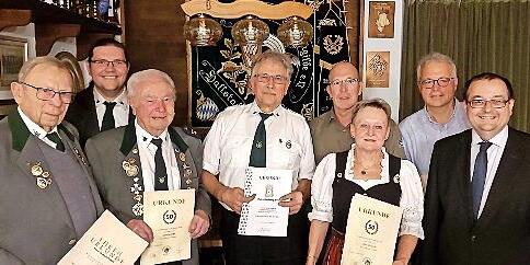 Im Rahmen der Schützenfeier mit Königsproklamation wurden zahlreiche Mitglieder für ihre 50-jährige Mitgliedschaft im Schützenverein der Königshof-Schützengilde Hallstadt sowie des Bayerischen Sportschützenbundes (BSSB) und des Deutschen Sportschützenbundes (DSB) mit den entsprechenden Urkunden und Abzeichen geehrt und ein Vereinspräsent übergeben.