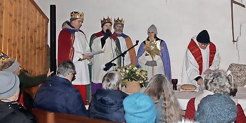 Anfangs des Gottesdienstes, zu dem rund hundert Besucher gekommen waren, zogen auch Erwachsene als Heilige Drei Könige mit ihrem Stern in die Halle ein und verkündeten ihre Botschaft. Diese stand auch als Motto über der Messfeier: „Wir haben den Stern gesehen und sind gekommen, um anzubeten“