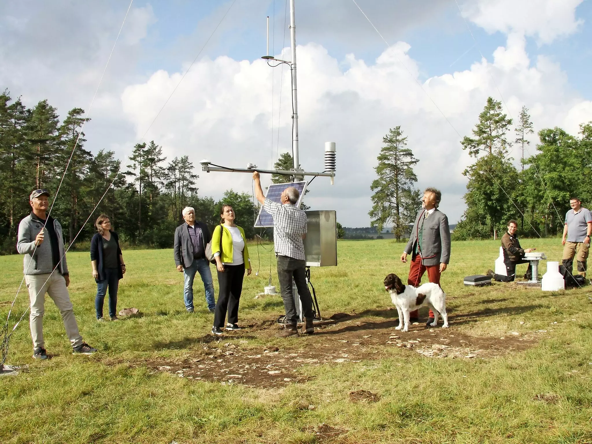 Ebermannstadt Das Waldklima ist jetzt messbar Beim Aufbau der Umweltmessstation Burg Feuerstein (von links): Christian König, Sibylle Appoldt, Hans-Peter Kaulen, Christiane Meyer, Hans-Joachim Krause, Peter Pröbstle sowie die Techniker Markus Huber und Michael Rager // Rosi König von Redaktion TEILEN  03.10.2021 Ebermannstadt Am Schluss ging alles ganz schnell. Nicht mal die widerspenstigen Steinformationen unter der hauchdünnen Bodenkrume konnten verhindern, dass 80 Zentimeter tiefe Betonverankerungen mitten auf einer idyllischen Wiese nahe der einzigartigen Wälder rund um die Burg Feuerstein angelegt wurden. Die Aufbauarbeiten für eine Umweltmessstation waren das Ergebnis einer gemeinsamen Initiative, ausgehend vom Ebermannstädter Christian König und seinem guten Draht zur Bayerischen Landesanstalt für Wald und Forstwirtschaft (LWF) im Forstzentrum Freising. Die Ebermannstadter Bürgermeisterin Christiane Meyer, Peter Pröbstle (Präsident der LWF) und Hans-Peter Kaulen (Leiter des Jugendhauses Burg Feuerstein) überzeugten sich vom Fortschritt der Arbeiten.Das endgültige „Go“ durch Peter Pröbstle kam vor wenigen Wochen. Bereits am Wahlsonntag waren alle Gerätschaften für den Betrieb einer Variante der Waldklima-Stationen in Bayern auf den Feuerstein transferiert worden. Zehn Meter hoher Mast Das LWF-Techniker-Team um Hans-Joachim Krause hat nun sämtliche für die meteorologische Datenerhebung und Funkübertragung im Sekundentakt benötigten Instrumente zusammenmontiert: ein zehn Meter hoher Mast für Wind-, Temperatur-, Luftfeuchtemessung, ein Sensor für Sonnenstrahlung, daneben eine Niederschlagswaage für Regen- und Schneemengen sowie Fühler für die Bodentemperatur in verschiedenen Tiefen. Die autarke Stromversorgung bewerkstelligt ein Solarpanel. Alles zusammen bildet die Umweltmessstation Feuerstein.Für die Standortwahl waren laut Pröbstle die Zugehörigkeit des Geländes zum Erzbistum Bamberg, die Zustimmung des Stiftungsrats Jugendhaus Burg Feuerstein sowie die „gesicherte Betreuung durch den 365-Tage-Betrieb mit technisch versiertem Personal entscheidend“. Jugendhausleiter Kaulen trug mit seiner unbürokratisch-anpackenden Art wesentlich zum Gelingen bei. Hintergrund und Treiber für das Zustandekommen dieses Projektes sind die Folgen aus der globalen Erwärmung durch den Klimawandel. Wasserstress lässt Bäume sterben Die Auswirkungen der trocken-heißen Extremsommern 2018/19 und teils 2020 zeichnen sich besonders auffällig auf den karstigen Jurahöhen Oberfrankens ab. Dort geraten die Bäume unter immer massiveren Wasserstress und sterben teilweise komplett ab. Bürgermeisterin Meyer wies auf die besondere Bedeutung der Forschung und der Umweltpädagogik im Klimawandel hin. Sie bedankte sich bei allen Beteiligten, dass die Idee einer „pädagogischen“ Umweltmessstation umgesetzt werden konnte. Vor allem hob sie dabei den bekannten Wetterexperten und Radiomoderator Christian König hervor, der nicht nur die Idee entwickelte hatte, sondern auch an der Umsetzung maßgeblich Beteiligt war.Die Umweltmessstation fügt sich bestens in das am Feuerstein gelebte Konzept der Bildung für nachhaltige Entwicklung ein und trägt mit vielfältigen Exkursionsmöglichkeiten, praktischem Anschauungsmaterial und einem erlebbaren Zukunftswald dazu bei, mehr Umwelt- und Klimabewusstsein zu entwickeln.