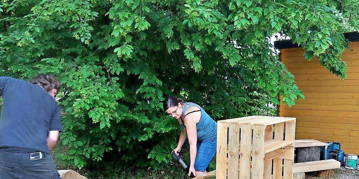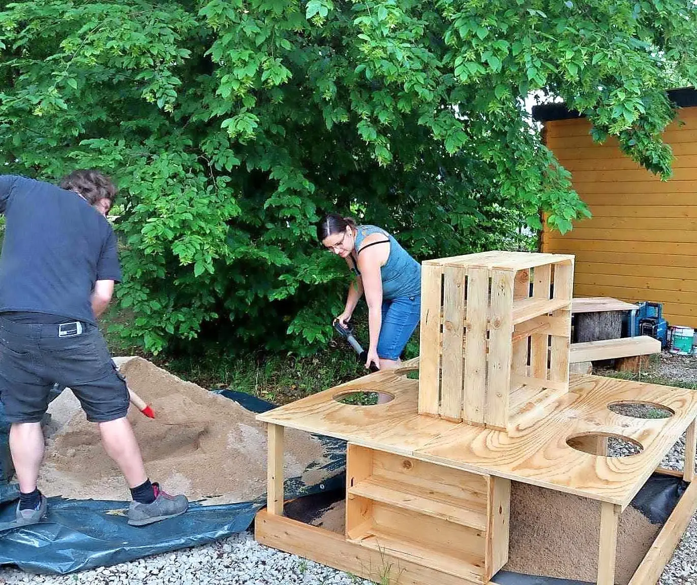 Elternaktionstag Eltern gestalten Matschküche und Spielstraße für Kinder … und eine große Matschküche. // Sandra Hager Es entstanden Hochbeete… // … eine Spielstraße… // von Sabine Memmel TEILEN  26.06.2023 Wiesenthau Bei einem Elternaktionstag der Kita Schlawiener in Wiesenthau gestalteten mehrere Eltern neue Spiel- und Sitzmöglichkeiten für ihre Kinder selbst. Entstanden ist dabei eine riesige Matschküche, mehrere neue Sitzmöglichkeiten, eine Gartenspielstraße für Autos sowie ein Mini-Hochbeet für die jüngeren Kinder mit Gießkannenhalterung. Schon vorab haben sich Eltern in verschiedene Projektgruppen eingeteilt und am vergangenen Samstag ihre Pläne in die Tat umgesetzt. Es wurde gesägt, geschliffen, gestrichen, vieles aus bereits vorhandenen Materialien, die Eltern zur Verfügung stellten. sam