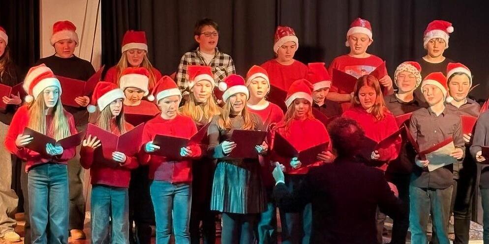 Der rot gekleidete Unterstufenchor mit Nikolausmützen unter der Leitung von Christian Moll bewies mit den zwei englischsprachigen Weihnachtsliedern „O Holy Night“ und „The First Noel“ erstaunliche Textsicherheit. Mit der Junior-Bigband fanden über 30 junge Leute und ihre Bandleiterin Schuler auf der Bühne ihren Platz. Nach Startschwierigkeiten meisterten auch diese mit der patriotischen amerikanischen Hymne „Glory Glory Hallelujah“ stimmungsvoll ihren Auftritt.