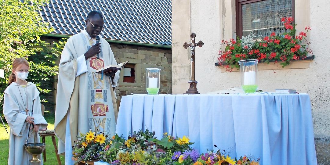 Der senegalesische Priester besprengt die farbenprächtigen Kräuterbüschel vor dem Altar mit Weihwasser und betet mit den etwa 70 Gläubigen der katholischen Pfarrei und der Nachbargemeinden im Unterhohenrieder Pfarrgarten. Es ist der Feiertag Mariä Himmelfahrt und Abbé Pierre spricht: „Segne, unser Gott, diese Kräuter und Blumen. Sie erinnern uns an deine Herrlichkeit und an den Reichtum deines Lebens. Schenke uns auf die Fürsprache Mariens dein Heil. Lass uns zur ewigen Gemeinschaft mit dir gelangen…“