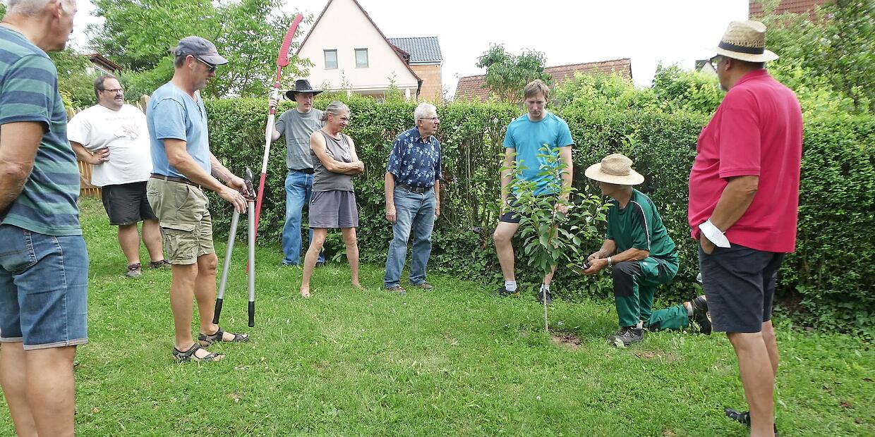 Der August ist nicht der Gartenmonat, in dem die meiste Arbeit anfällt, dennoch gibt es einiges zu tun. So trafen sich vor kurzem die Eberner Gartenfreunde mit dem Gartenexperten Edgar Brohm in einem Garten, um einiges über die im Sommer anfallenden Arbeiten an Obstgehölzen zu hören. Immer häufiger werden Gehölze auch im Sommer geschnitten. Meist geschieht das im Juli oder August, ergänzend zu den Schnitt- und Formierungsarbeiten im Winter. Bei Sauerkirschen, Pfirsichen und Aprikosen kann der Winterschnitt sogar vollständig entfallen, wenn im Sommer richtig und ausreichend geschnitten wird.