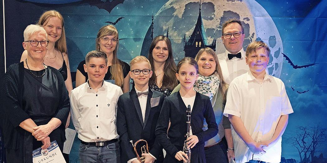 Anna Frenzel vom Nordbayerischen Musikbund ehrte verdiente Mitglieder. Silke Schaumlöffel wurde für 25 Jahre und Christina Gütlein für 20 Jahre aktives Musizieren geehrt. Über die Verleihung der Ehrennadel für ihre bestandene D1-Prüfung freuten sich Laura und Leon Schliederer, Hannes Düthorn und Jakob Weber. Mit Elfriede und Maria Nußbaum wurden Mutter und Tochter mit dem D2-Leistungsabzeichen ausgezeichnet.