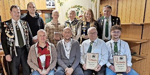 Willi Thein führte die Siegerehrung des Preisschießens durch. Bei der Jugend waren Henrik Reuter und Leon Präger am Start, und Henrik konnte sich alle Pokale und Scheiben sichern. Den Jugendpokal mit einem 350,9-Teiler, die Jugendscheibe mit einem 160,4- und den Jugendkönigspokal mit einem 61-Teiler. Beim Königspokal war der zweite Schützenmeister selbst siegreich, er hatte einen 30,78-Teiler.