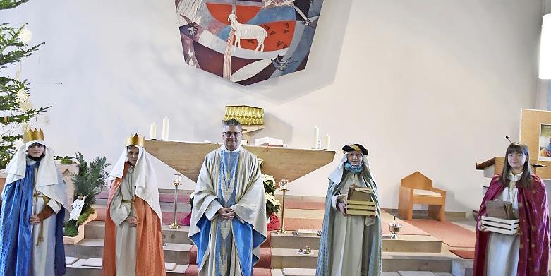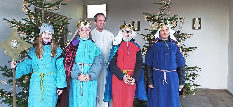 LKR Haßberge Wichtige Dinge kamen in die Tüte Die Königsberger Sternsinger brachten die Segenstüten an die Stellen, wo sie später abgeholt werden könnten. // Gerold Snater Zum Dreikönigsgottesdienst in St. Laurentius Ebern segnete Pfarrer Rudolf Theiler die Sternsinger. // Veronika Müller Die Sternsinger aus Schönbach (von links): Maja Eltschka, Johanna Geisel, Gemeindereferent Matthias Vetter, Max Stretz und Emanuel Kleinhenz // Ewald Kleinhenz von Redaktion TEILEN  07.01.2022 LKR Haßberge Durch die Corona-Pandemie ist vieles anders geworden. Auch die von den katholischen Pfarrgemeinden normalerweise ausgesendeten Sternsinger konnten in diesem Jahr aufgrund der vorgeschriebenen Hygienemaßnahmen wieder nicht von Haus zu Haus ziehen, um dort das *C+M+B* mit der Jahreszahl 2022 an die Tür zu schreiben und das Haus zu segnen. Deshalb haben sich viele Pfarreien entschieden, wieder sogenannte Segenstüten zur Abholung in den Kirchen und an anderen Orten bereitzustellen. In Königsberg wurden diese Segenstüten in St. Josef im Gottesdienst am Vormittag des Dreikönigstages von Pfarrer Stephan Eschenbacher gesegnet. In diesen Tüten befinden sich Aufkleber mit 20*C+M+B*22 , ein Segensspruch und ein Überweisungsträger für die Sternsingeraktion, die in diesem Jahr unter der Überschrift „Gesund werden, gesund bleiben – ein Kinderrecht weltweit“ steht. In Königsberg können die Segenstüten in der Josefskirche, in der Marienkirche und bei Blumen Elisabeth abholt werden.In Ebern segnete beim Dreikönigsgottesdienst Pfarrer Rudolf Theiler die Sternsinger in der Pfarrkirche St. Laurentius. Diese Mädchen und Jungen standen symbolisch für alle Sternsinger, die coronabedingt wieder nicht zu den Häusern gehen konnten. Die Gruppe sprach den Segen Gottes in einem Sternsingerlied für die ganze Gemeinde, für Familien und besonders für Kranke und Alte aus. Musikalisch wurde der Gottesdienst von Wolfgang Schneider an der Orgel und Paul Marks mit der Trompete begleitet. Spendentütchen, Kreide und Segensaufkleber können in der Pfarrkirche St. Laurentius Ebern auch noch in den nächsten Tagen abgeholt werden. Die Spendentütchen können in den nächsten Gottesdiensten oder im Briefkasten des Pfarrhauses/ Pfarrbüros abgegeben werden.Auch in Schönbach durften die Heiligen Drei Könige nicht wie üblich von Haus zu Haus ziehen. Deshalb wurden für alle Haushalte Segenspakete mit den Aufklebern für die Haustüre, einem Flyer und einem Spendentütchen gepackt. Diese wurden von den Schönbacher Ministranten nach dem Wortgottesdienst mit dem Gemeindereferenten Matthias Vetter am 6. Januar einzeln in alle Haushalte verteilt. „Wir hoffen, dass im nächsten Jahr die Hl. Drei Könige wie gewohnt den Segen in die Häuser bringen dürfen“, heißt es in einer Mitteilung der Verantwortlichen aus Schönbach. sn/red