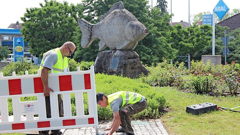 Höchstadt a. d. Aisch Damit der Kreisel grün bleibt // von Karina Brock TEILEN  14.06.2021 Höchstadt a. d. Aisch Ein wenig Gesellschaft bekam Fridolin dieser Tage: Zwei Arbeiter versperrten ihm kurzzeitig die Sicht. Die Bewässerung am Karpfenkreisel war kaputt und musste repariert werden. Damit es um den steinernen Fisch nicht irgendwann komplett grau wird, schufen die beiden fleißigen Herren Abhilfe. So bekam der Karpfen auch mal wieder etwas anderes zu sehen, als immer nur den oft dichten Verkehr rund um seinen Sockel. Foto: Karina Brock