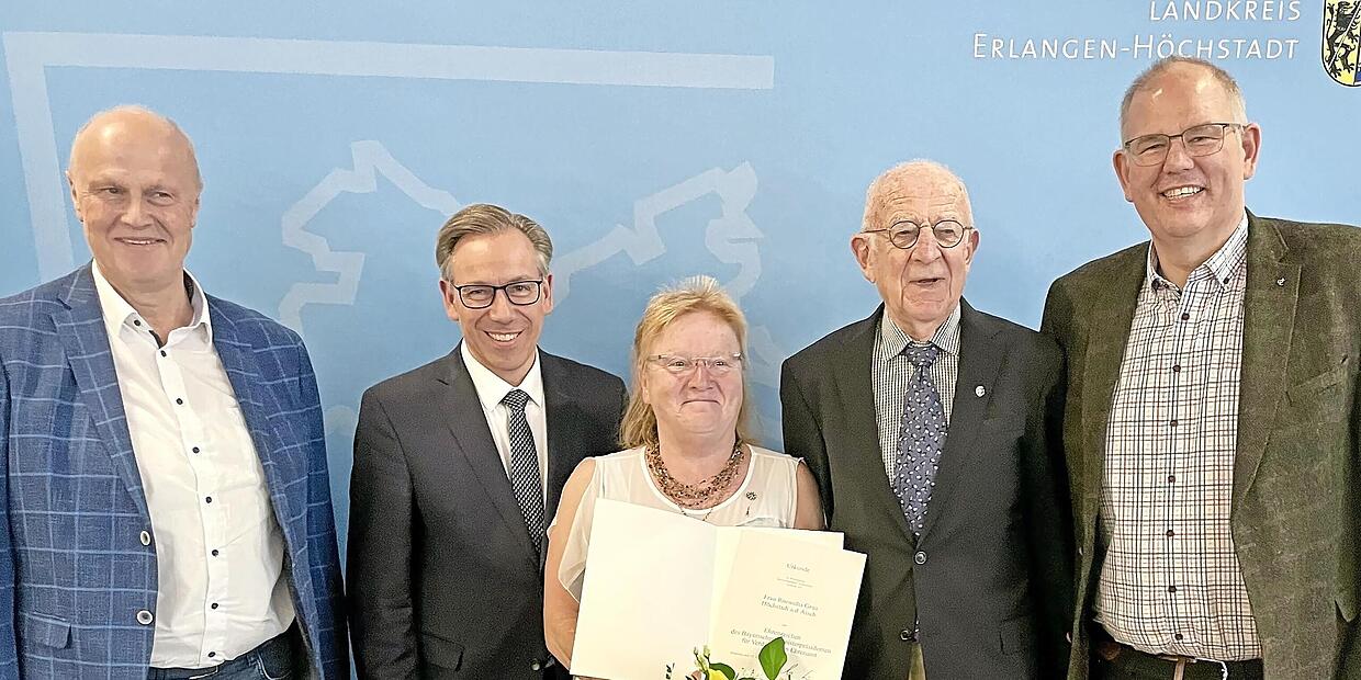 Ministerpräsident Markus Söder hat Roswitha Grau aus Höchstadt und Friedrich Franke aus Möhrendorf das Ehrenzeichen des Bayerischen Ministerpräsidenten für Verdienste im Ehrenamt verliehen. Landrat Alexander Tritthart überreichte die Auszeichnung im Rahmen einer Feierstunde im Landratsamt.