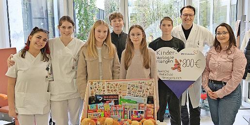 Stellvertretend für die Klasse übergaben Sophia Erhardt, Leo Sponsel, Hanna Geier und David Himsel gemeinsam mit Projektleiterin Ebru Saki 800 Euro sowie eine große Kiste voller Stifte, Bücher, Kuscheltiere und Stickerbögen an Prof. Dr. Markus Metzler, Leiter der Kinderonkologie der Kinder- und Jugendklinik des Uniklinikums Erlangen.