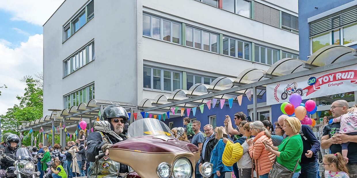 Der Weg war für die gut gelaunten Biker aber noch nicht das Ziel. Ihre Intention war es vielmehr, den kleinen Patientinnen und Patienten eine nicht alltägliche Freude zu bereiten. So brachten sie im Rahmen des Toy Runs, den der Verein „Toy Run – Träume für kranke Kinder Erlangen“ bereits zum 30. Mal veranstaltete, Sach- und Geldspenden in Höhe von 45.000 Euro.