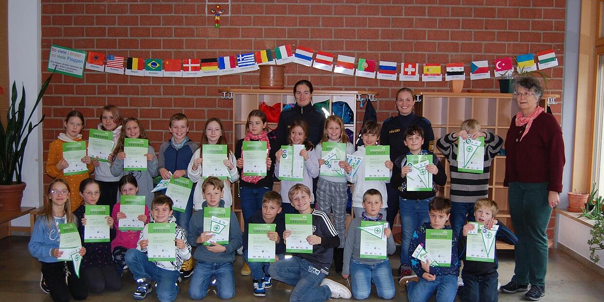 Der krönende Abschluss der Radfahrausbildung: Im Realverkehr fahren die Kinder teils auf eigenen, teils auf geliehenen Rädern durch den Schulort. Dank vieler Eltern und Großeltern, die sich den Vormittag Zeit nehmen, werden sie dabei gut beobachtet und begleitet. Ohne Herzklopfen geht es allerdings nicht ab: Ob sie den Weg finden? Ob die Autofahrer wirklich anhalten bei rechts vor links? Und vor allem: Ob Anfang Dezember das Wetter mitspielt? Kalt war es in diesem Jahr und leider auch zu glatt. Deshalb konnten nur die Marktbreiter Klassen fahren. Als alle Kinder wieder wohlbehalten in der Schule angekommen sind, bekommen die Eltern ein warmes Getränk zum Aufwärmen. Bei der Urkundenverleihung zeigen die Polizistinnen eindrucksvoll, wie ein Helm den Kopf schützt: Ein rohes Ei zerbricht darin nicht.