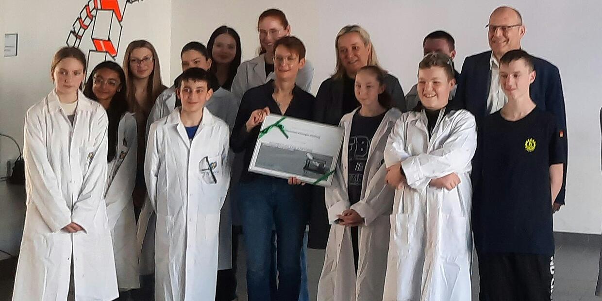 Ausgezeichnet wurde das Projekt "Physikanten meets MKS", das im April des letzten Jahres stattfand und dessen Ergebnisse am großen Experimentetag Eltern, Schülern und Gästen vorgestellt wurden. Um einen solchen Preis zu erhalten, mussten bestimmte Kriterien erfüllt sein. So musste der Schwerpunkt eindeutig auf den naturwissenschaftlichen Fächern liegen. Die Teilhabe der ganzen Schulfamilie (Lehrer, Eltern, Schüler) sowie die schulartübergreifende Kooperation mit dem AKG (Fachbereich Chemie) und der Realschule Kitzingen (Fachbereich Physik) waren außerdem ausschlaggebend. Die Präsentation der Ergebnisse am Experimentetag und die Kombination der genannten Kriterien war für die Schaeffler FAG Stiftung überzeugend, so dass sie der Mittelschule Kitzingen-Siedlung dafür einen ersten Preis überreichen konnte. Stellvertretend für alle nahmen Repräsentanten der Schülerschaft und der Lehrkräfte die Urkunde vom Geschäftsführer Herrn Schuster und Frau Feuerbach entgegen. Die Feierstunde endete schließlich mit einem kleinen Imbiss für alle, der unter Beteiligung von Schülerinnen vorbereitet wurde.