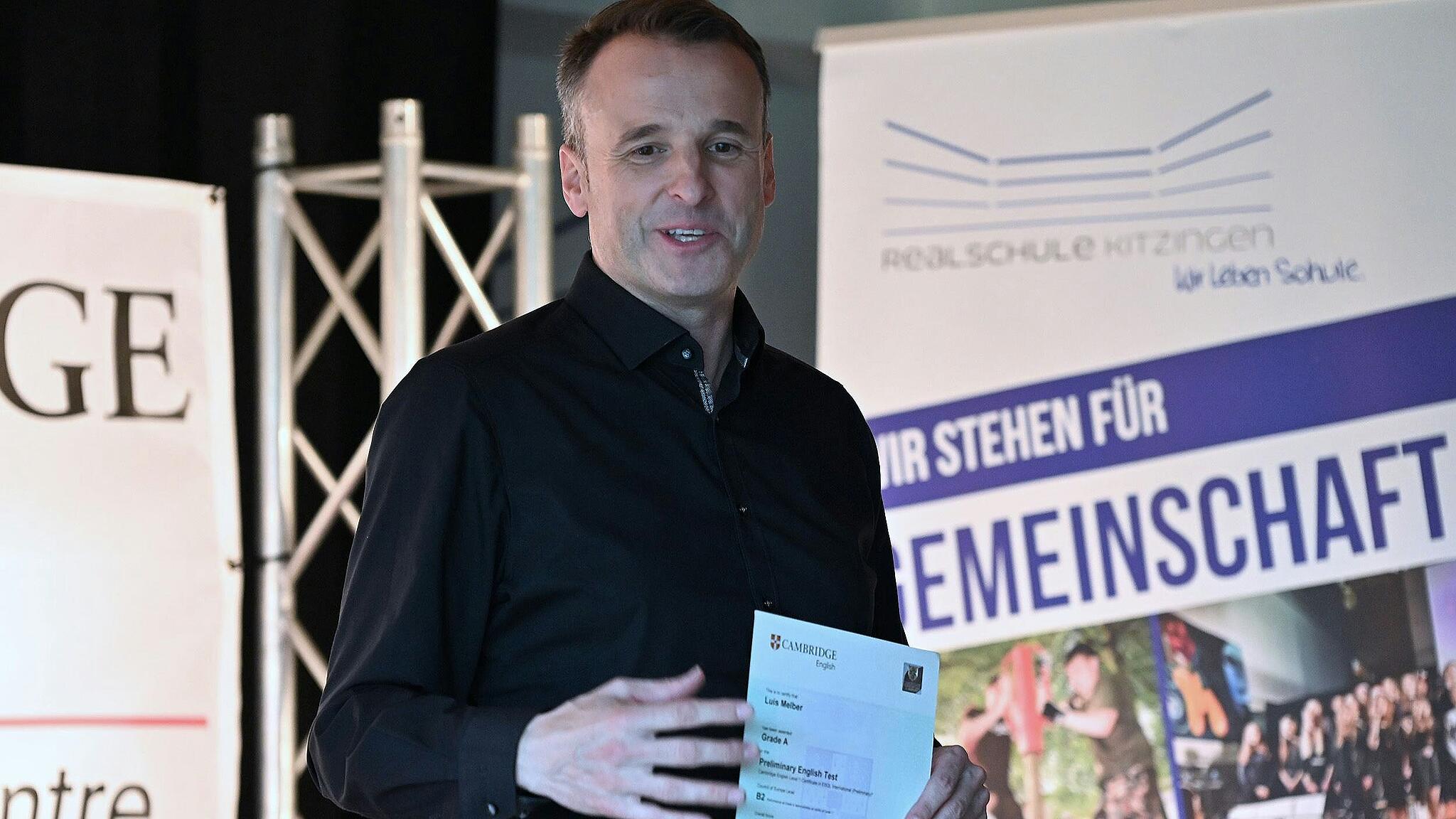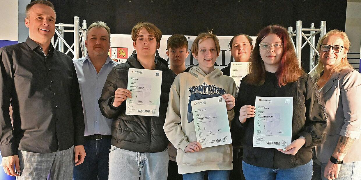 Kitzingen Feierstunde mit Verleihung der Cambridge-Zertifikate „Großer Bahnhof“ für die erfolgreichen PET-Absolvent*innen der Realschule Kitzingen (von links): Robert Kolb (Kursleiter PET), Jochen Hüllmandel (stellvertr. Schulleiter), Niklas Oerter, Luis Melber, Maria Sieniuc, Felix Unger, Zuzanna Stopyra und Kerstin Wirsing (Elternbeiratsvorsitzende). Es fehlen die Absolventinnen Aya Alasaad und Leni Waldmann. // Elke Anselm Die Verantwortliche Lehrkraft für das englische Sprachzertifikat PET, Robert Kolb, lobt seine erfolgreichen Schülerinnen und Schüler. // Elke Anselm von Pressemitteilung TEILEN  06.11.2024 Kitzingen Doch stellvertretender Schulleiter, Realschulkonrektor Jochen Hüllmandel konnte gemeinsam mit Kursleiter Robert Kolb nicht nur allen die begehrten Zertifikate überreichen, er freute sich auch darüber, dass sechs von sieben Teilnehmern dabei sogar das eigentlich über dem PET-Test liegende Sprachniveau B2 erreichten. Seit Beginn des letzten Schuljahres hatten sich die Schülerinnen und Schüler einmal pro Woche zusätzlich zum normalen Pflichtunterricht am Nachmittag in Workshops getroffen, um sich gut auf den anspruchsvollen Test vorzubereiten, bei dem erfolgreichen Teilnehmern ein besonderes Niveau in den wesentlichen Fähigkeiten einer Fremdsprache (den sogenannten "skills") bescheinigt wird.An zwei Samstagen im Mai war es dann so weit: Die Probanden machten sich in ihrer Freizeit auf den Weg zum Prüfungsort, der Wilhelm-Sattler-Realschule in Schweinfurt, wo eine über dreistündige Testphase mit Reading, Writing und Speaking anstand, in der Lese-, Schreib- und Hörverständnis sowie mündliche Ausdrucksfähigkeit in der Fremdsprache Englisch geprüft wurden.Genauso wie stellvertretender Schulleiter Jochen Hüllmandel sprach auch Elternbeiratsvorsitzende Kerstin Wirsing allen Absolventen ihre Hochachtung zu den Leistungen aus und betonte vor allem den Wert des Zertifikats für den beruflichen Werdegang. Als besonderes Zeichen der Wertschätzung hatte sie von Seiten des Elternbeirats kleine Präsente für alle Teilnehmer sowie den Kursleiter parat.Einen ansprechenden Rahmen bekam die Veranstaltung durch die musikalische Umrahmung der Geschwister Vasilisa und David Heinz.Von: Robert Kolb (Kursleiter PET und Lehrkraft an der Staatlichen Realschule Kitzingen)