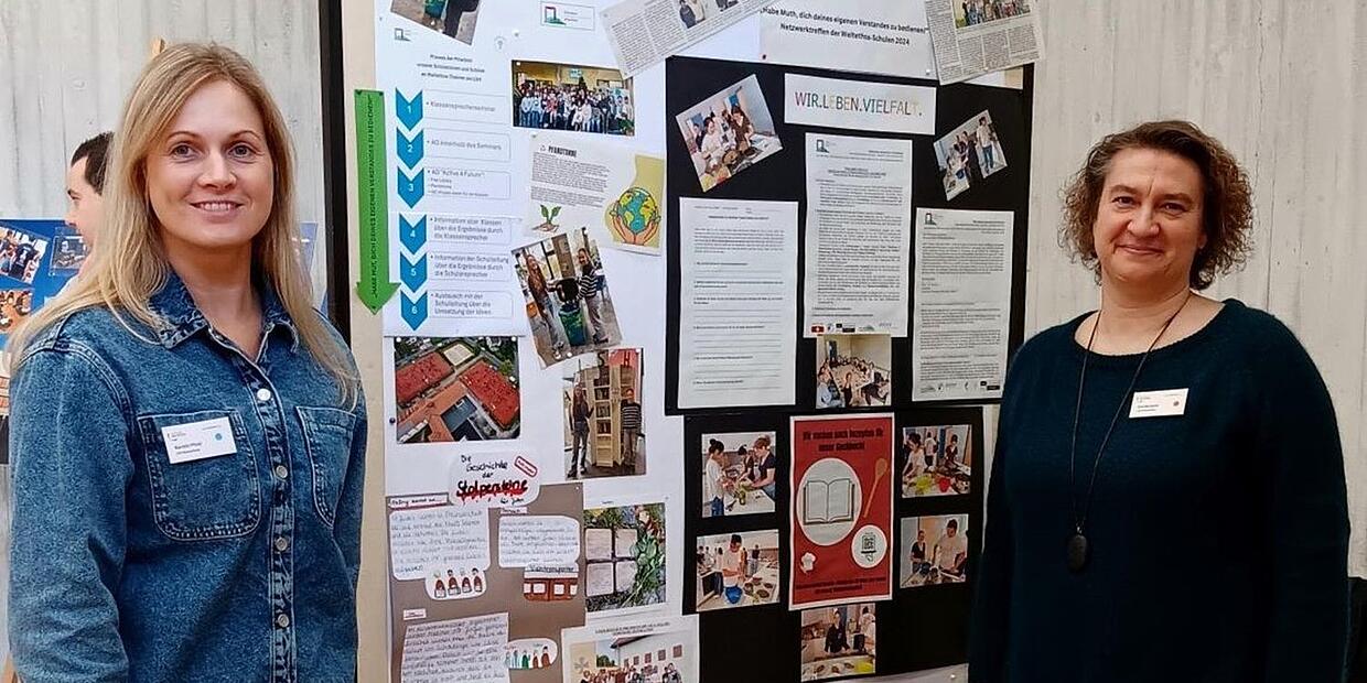 Wiesentheid Ideenaustausch beim Netzwerktreffen aller Weltethos-Schulen Eva Burkard (rechts) und Kerstin Pfost vor dem Info-Stand zu ausgewählten Weltethos-Aktionen des LSH. // Kerstin Pfost von Pressemitteilung TEILEN  26.11.2024 Wiesentheid Von: Kerstin Pfost (Lehrerin, Gymnasium Steigerwald-Landschulheim Wiesentheid)