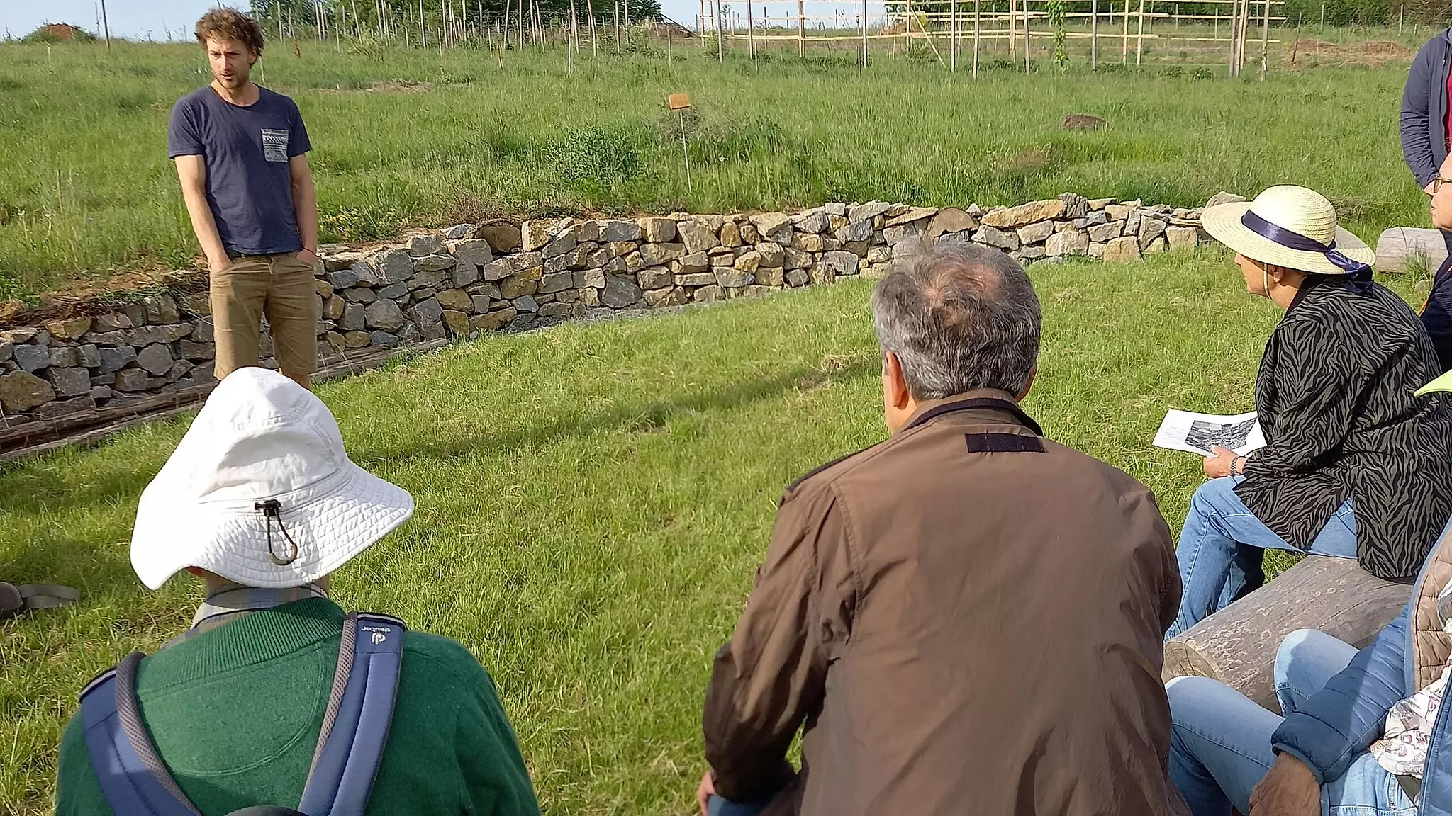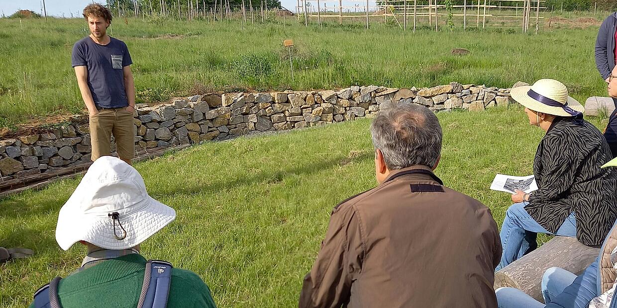 Volkach Neue Wege in der Landwirtschaft mit der Natur Sebastian Hausmann bei seinen Erläuterungen zum Vielfaltwald in Oberaltertheim. // Erich Helfrich von Pressemitteilung TEILEN  22.05.2024 Volkach Die Zielsetzungen der beiden Unternehmungen ähneln sich: Mithilfe von regenerativen Dauerkulturen soll Wasser in der Flur insbesondere am Hang gehalten, der Aufbau von Humus gewährleistet, die Artenvielfalt gestärkt und gleichzeitig nachhaltig gesunde Lebensmittel erzeugt werden. Beim Vielfaltwald in Oberaltertheim erzeugt eine Gruppe junger Leute westlich von Würzburg unter der Führung eines jungen Landwirts vorwiegend Beerenobst zunächst für den eigenen Bedarf, aber auch zur Vermarktung über einen Hofladen. Es wird auf eine vielfältige Pflanzung auf mehreren Ebenen gesetzt: Strauchschicht, Baumschicht, Beerenschicht und eine Bodeneinsaat über die gesamte Fläche. Außerdem bieten Steinhaufen, Sandbänke und Holzbiotope vielfältige Strukturen und Lebensräume für eine Vielzahl an verschiedenen Tier,- und Pflanzenarten. So entsteht unter den jungen Leuten, teilweise mit kleinen Kindern, auch ein Bewusstsein für Naturschutz und gesunde Lebensmittel.Der Biohof Frey hat sich für die Bewirtschaftung mit Agroforst entschieden. Die schnell wachsenden Baumarten wie Pappeln sind in Reihen gepflanzt, bremsen den Wind und können in mehreren Metern Tiefe die Feuchtigkeit halten sowie Kulturpflanzen vor Sonneneinstrahlung schützen. Wirtschaftlich besonders attraktiv sind etwa 4000 Legehennen, die in biologischer Freilandhaltung in drei Mobilställen gehalten werden. Die Legehennen werden vorwiegend mit dem hofeigenen Futter ernährt. Die Hühner werden von zwei Herdenschutzhunden beschützt. Die beiden Hunde sind in die Hühnerherde hineingeboren und betrachten sie als ihr Rudel. Habicht und Marder haben keine Chance. Die landwirtschaftlich genutzte Fläche von ca. 68 Hektar reicht aus, um die Hühner und 20 Mutterkühe mit Futter zu versorgen. Die Rinder sind eine Fleischrasse, die ihre Kälber mit der eigenen Milch aufzieht und nicht gemolken werden muss. Die Teilnehmenden zeigten sich von den Strategien und Lösungen begeistert.Von: Gerda Hartner (1. Vorsitzende, Ortsgruppe Volkach im Bund Naturschutz)