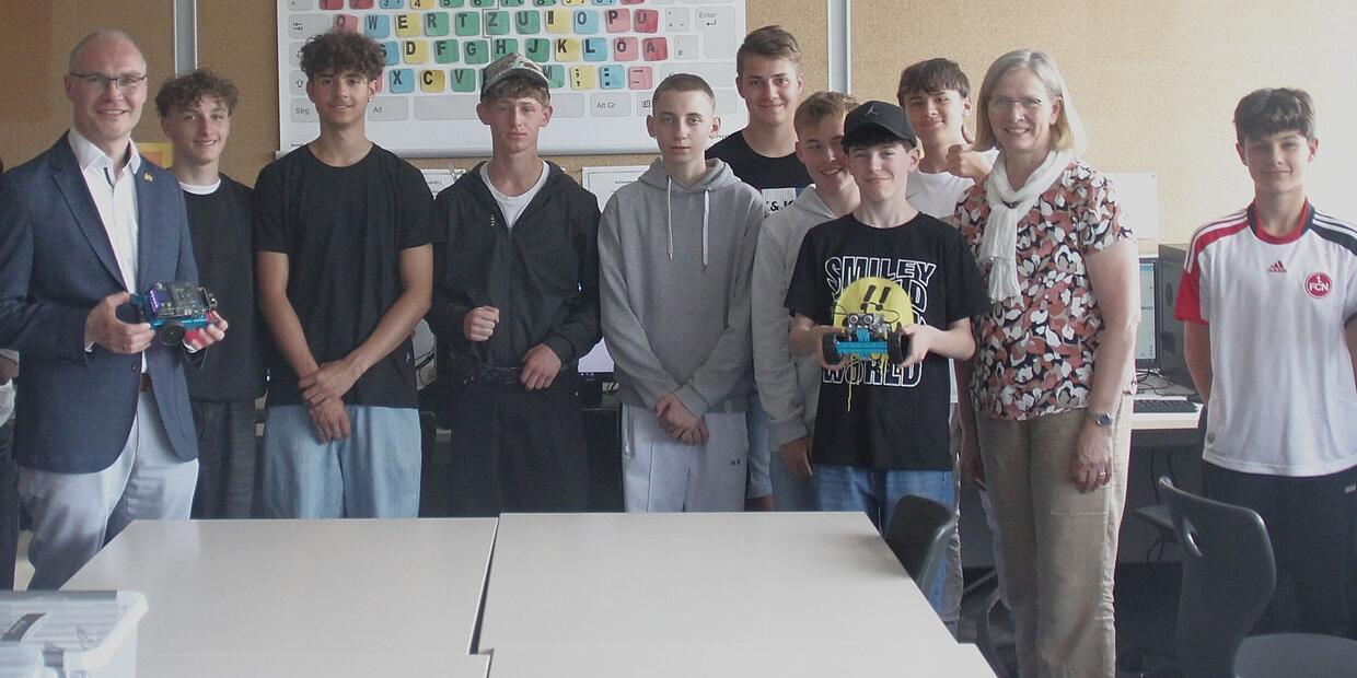 Selbst der Iphöfer Bürgermeister, Herr Dieter Lenzer ließ es sich nicht nehmen, im Informatikunterricht der Klasse 8 M vorbeizuschauen und sich bei den Schülerinnen und Schülern zu erkundigen, wie der Einsatz der Bausätze im Unterricht ankommt.