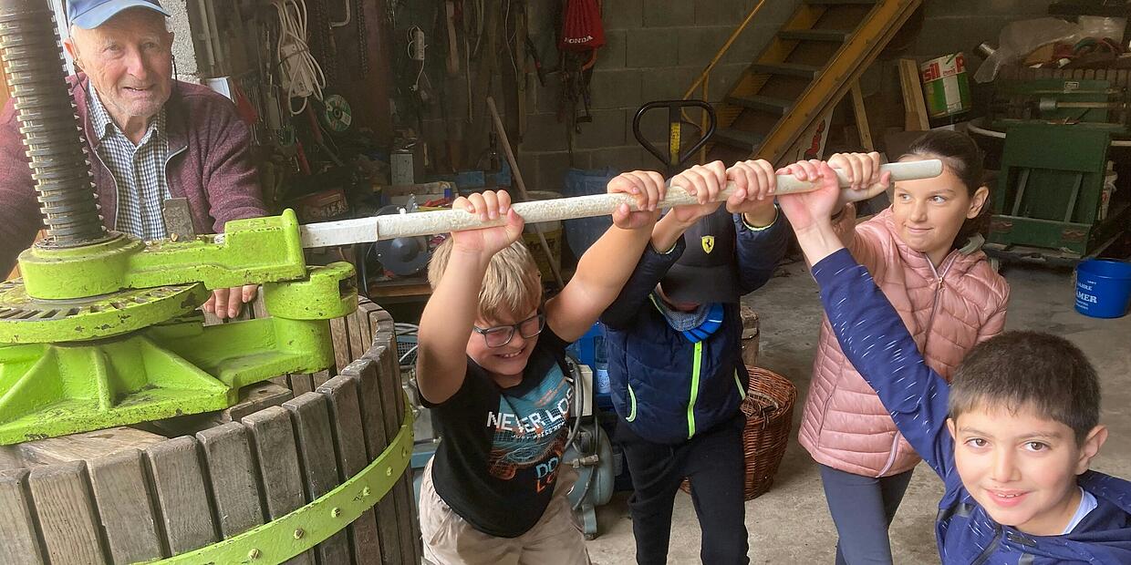 Höhepunkt war das Pressen des Apfelsafts, das sowohl den Kindern als auch dem "Keltermeister" und Obstexperten Hans Biener die gesamte Kraft abverlangte. Im Anschluss konnten die Kinder den selbst gepressten Saft genießen und sogar in Flaschen mit nach Hause nehmen.