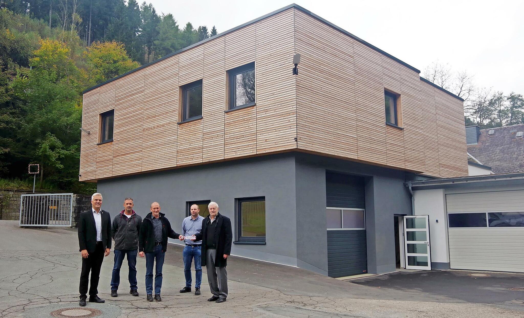 Als kleines Einweihungsgeschenk beteiligte sich Feuerpfeil an einer neuen Kaffeemaschine für die Bauhof-Mitarbeiter. Sehr freute man sich auch über vier große Reise-Fotografien des „Ludschter“ Globetrotters Heiko Beyer im Wert von 1 000 Euro, die im Treppenhaus einen Ehrenplatz fanden.
