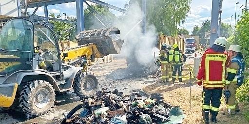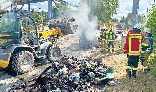 Polizei und Feuerwehr meldeten am Mittwoch gegen 16.45 Uhr ein Feuer auf der Müllumladestation in Neuses. Nach erster Auskunft der Feuerwehr war ein Presscontainer in Brand geraten. Die notwendigen Löscharbeiten wurden von den drei Feuerwehren aus Neuses, Kronach und Johannisthal durchgeführt. Foto: Feuerwehr Kronach
