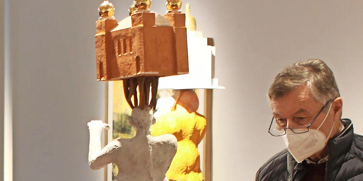Zu sehen sind vom Bildhauer Lothar Seruset mehrere Skulpturen. Er arbeitet vorwiegend mit Holz, das er bemalt – manche Arbeit gießt er später in Bronze. Seine für ihn typischen Figuren zeigen Menschen, Landschaften, Tiere und Dinge wie Autos, Häuser oder Flugzeuge, Kirchen, Moscheen oder auch mal eine Arche Noah. Dabei wird alles zu einer vertikalen Säule gestapelt. Mal balanciert der Mensch auf einem Tier, mal auf einem Auto. Er balanciert sich gleichsam durchs Leben – auf dem Kopf einen Stapel mit Wünschen, Träumen, Hoffnungen, vielleicht aber auch Albträumen und schwerer Last. So entstehen Hierarchien, die von inneren und äußeren Einflussfaktoren auf Menschen zeigen. Oft gesellen sich mehrere Figuren zu einer Gruppe.