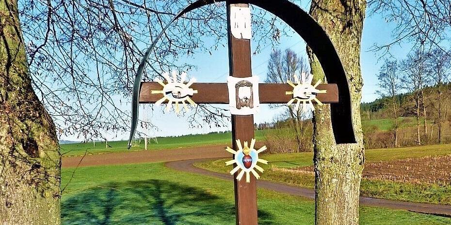 Feldkreuz Symbol für die Wunden Jesu Das Fünfwundenkreuz bei Glosberg // Gerd Fleischmann von Gerd Fleischmann TEILEN  23.12.2021 Glosberg Auf dem Weg von Glosberg nach Reitsch befindet sich eines der wenigen Fünfwundenkreuze im Frankenwald. Sie sind seit Jahrhunderten Ausdruck gelebter Volksfrömmigkeit und laden Wanderer zur Rast und zum Gebet ein. Für die Pilger zur Glosberger Wallfahrtskirche Mariä Geburt ist dies immer wieder ein besonderer Ort, an dem man Kraft, Mut und Hoffnung schöpfen kann, vor allem in der aktuellen Corona-Krise. Und von diesem sakralen Schmuckstück – umrahmt von zwei stattlichen Bäumen – weitet sich der Blick ins Haßlachtal. Deutlich erkennbar ist die symbolische Darstellung der fünf Wunden Christi. Die Tafel, die symbolisch das Christusantlitz zeigt, scheint magische Anziehungskraft zu besitzen. Sie wurde 2005 und 2020 von Unbekannten entwendet. Nach Aussage des ehemaligen Kreisheimatpflegers Roland Graf ist das Fünfwundenkreuz vermutlich 1859 errichtet worden. Große Verdienste um den Erhalt – eine umfassende Sanierung erfolgte 2013 – erwarb sich der Glosberger Robert Baehr. Außerdem kümmerte sich seine Frau Marianne liebevoll um den Blumenschmuck. gf