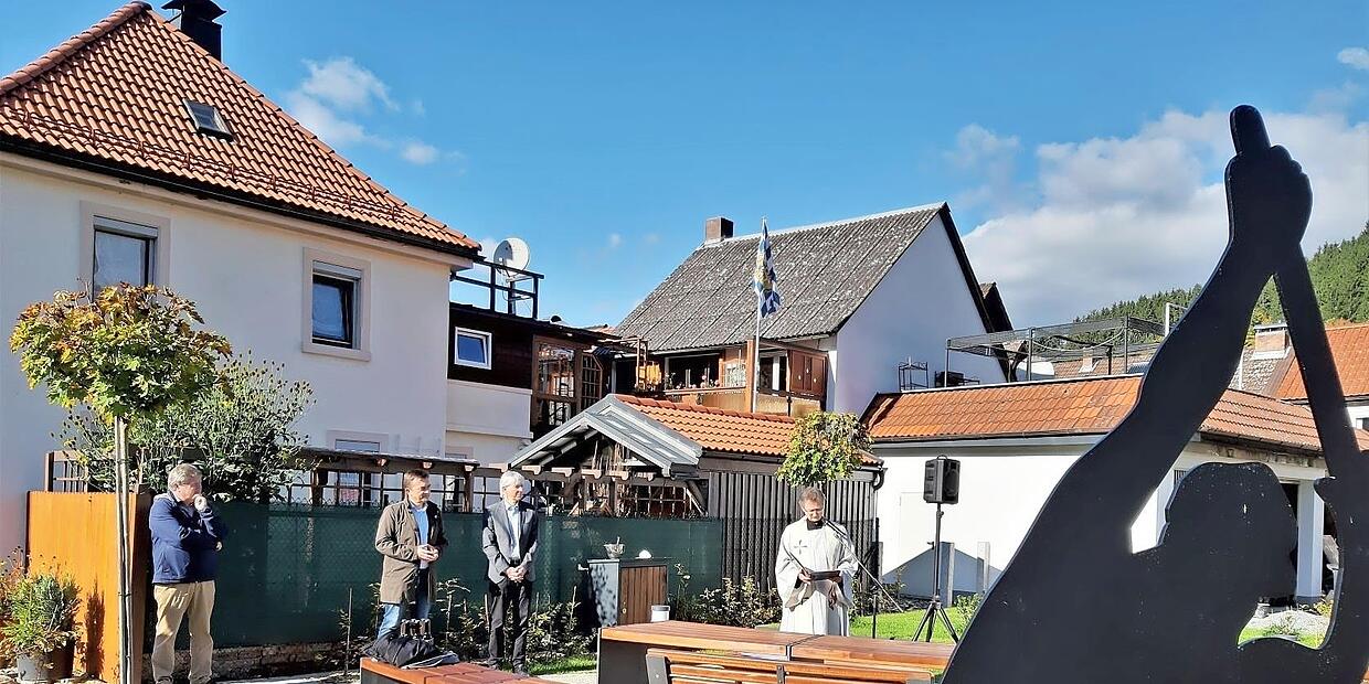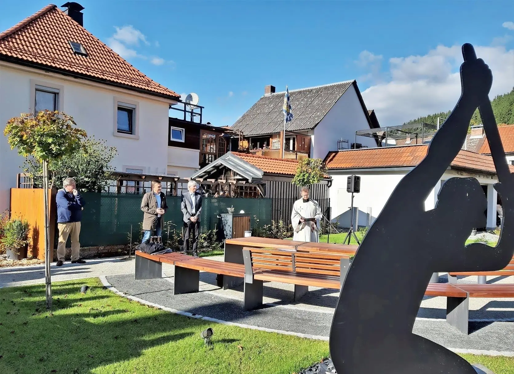 Wallenfels Von der Ruine zum Schmuckstück Pater Jan Poja segnet den neu gestalteten Platz an der Kellerstraße 12. Mit im Bild von links Erich Mähringer, Bürgermeister Jens Korn und Vizeregierungspräsident Thomas Engel. // Susanne Deuerling von Susanne Deuerling TEILEN  25.10.2021 Wallenfels Wallenfels — In Wallenfels ist ein Schmuckstück fertig geworden und erhielt durch Pater Jan Poja nun auch den kirchlichen Segen. Einen Segen, der nicht nur das Grundstück und seine Anlage, sondern vor allem auch die Menschen begleiten soll, die sich auf diesem Platz treffen, die miteinander ins Gespräch kommen und Neuigkeiten austauschen. Wanderer, die hier rasten und Gäste, die einfach das schöne Ambiente genießen. Deshalb ging Pater Jan in seinem geistlichen Impuls auch vor allem auf das Thema „Entspannung und Ruhe“ ein. Das sagenumwobene Haus des „Routn Zeußn Bartl“ ist verschwunden. Aus der Ruine, die seit den 80er Jahren leer stand, ist eine kleine Parkanlage geworden, wo man sich gerne treffen und ratschen kann, ein Treffpunkt für die ganze Nachbarschaft, für Gäste und vorbeiziehende Wanderer. Bis 2019 stand das Gebäude leer und verfiel zusehends. Mit der Förderoffensive Nordostbayern konnte nun etwas bewegt werden. Bei einer Förderung von 90 Prozent ergriff die Stadt Wallenfels die Chance und erwarb Haus und Grundstück. Es wurde abgerissen und die Fläche neu gestaltet. Die Baukosten belaufen sich auf 170 000 Euro, davon waren 123 000 Euro förderfähig. Das heißt, die Regierung von Oberfranken gab einen Förderzuschuss von 111 300 Euro. Bürgermeister Jens Korn dankte dafür dem Vizepräsidenten der Regierung von Oberfranken, Thomas Engel, recht herzlich und hieß ihn bei dieser Einweihung aufs Herzlichste willkommen. Dank sagte Korn auch den Nachbarn, die sich neben den beauftragten Firmen bei der Schaffung dieses kleinen Paradieses eingebracht haben, stellvertretend seien genannt Marcel Guillemaille und Stefan Weger. Ansprechend angeordnet wurden Bänke, geschwungen und bequem, ein Tisch, auf dem man auch mal eine Brotzeit machen kann und viel Grün und farbige Blumen rundherum. Als besonderer Blickfang steht der Frankenwaldflößer auf seinem Holzfloß stattlich direkt am Gehsteig. „Wir wollten auch hier zeigen, dass Wallenfels und die Flößerei zusammengehören und einen zusätzlichen Blickpunkt schaffen“, erklärt Bürgermeister Jens Korn.Regierungsvizepräsident Thomas Engel beglückwünschte die Stadt Wallenfels, Bürgermeister Jens Korn und alle Bürger zu diesem neuen Treffpunkt mitten in der Stadt. Man sei seitens der Regierung froh, mit dem Förderprogramm Nordostbayernoffensive maßgeblich dazu beigetragen zu haben, solche schönen Flächen zu schaffen. Die Ortskerne würden dadurch aufgewertet und viele Städtebauliche Missstände beseitigt. Man wolle zwar viel ältere Bausubstanz erhalten, aber baufällige Ruinen gehören sicher nicht dazu. Thomas bescheinigte der Stadt Wallenfels viel Engagement, denn dies ist nicht das einzige Projekt, das man schon in Angriff genommen habe. Er hoffte, dass dieser Platz auch gut genutzt werde, von Einheimischen und Gästen gleichermaßen.Die kirchliche Segnung und die Eröffnung durch Bürgermeister Jens Korn wurde vom Musikverein Wallenfels umrahmt, dessen Musiker sich sichtlich darüber freuten, endlich wieder in der Öffentlichkeit musizieren zu können. Mit guten Gesprächen und dem einen oder anderen Freibier aus der Brauerei Malzschmied ging ein sonniger Nachmittag seinem Ende zu.