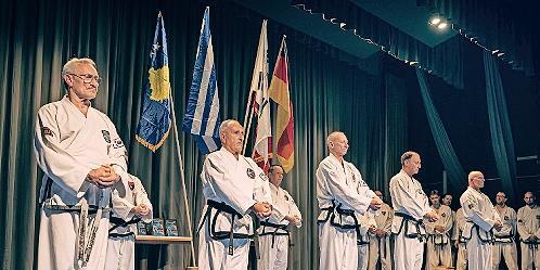Um 19 Uhr begann die Benefizgala in der ausverkaufte Halle. Sieben Großmeister und weitere 70 Danträger boten ein spektakuläres Programm mit Formenläufen, Kampf- und Technikkombinationen und atemberaubenden Bruchtests.