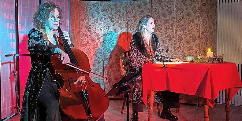 Die Münchnerin Stefanie Mendoni, in Thurnau längst keine Unbekannte mehr, beeindruckt durch ihren präzisen, nuancierten Mundart-Vortrag und ihren klaren Gesang. An ihrer Seite entlockt Sibylle Friz aus Bayreuth ihrem Cello fesselnde Klänge. Ein perfektes Duo. Komplettiert wird es durch Wolfgang Ries (Musikarrangement) und Wolfgang Krebs (Lichteffekte).