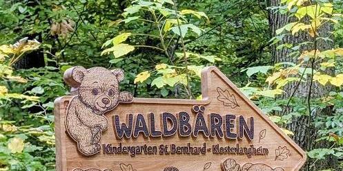 Mit Beginn des neuen Kindergartenjahres hatten die Eltern der Waldbären des Kindergartens St. Bernhard die Möglichkeit, den Waldplatz gemeinsam mit ihren Kindern zu erkunden. Bereits ein kurzes Stück vom Kindergarten im Prälatenweg entfernt wartete ein besonderes Highlight auf die Besucher: der frisch aufgestellte Waldbären-Wegweiser. Dieser zeigt allen den Zugang zum Waldplatz. Besonders stolz ist Waldbär Leni Raab, denn ihr Vater Bernhard Raab hat das beeindruckende Schild eigenhändig gefertigt.