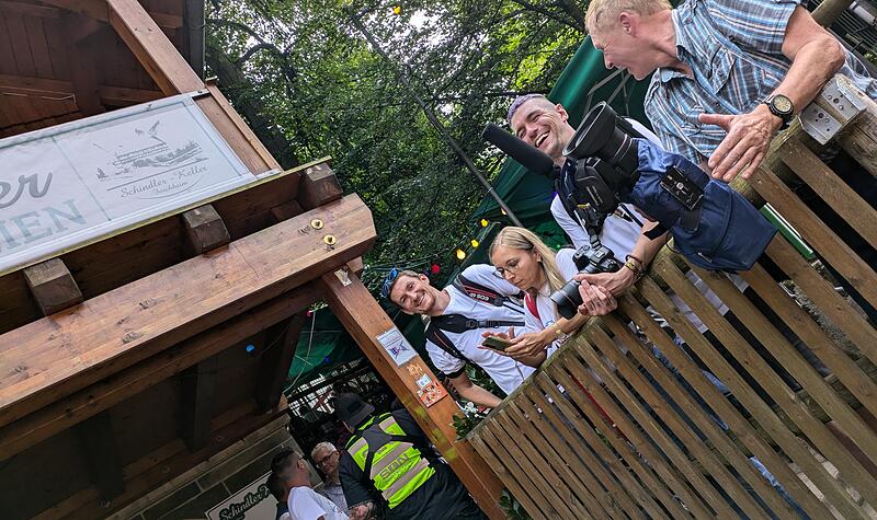 Unsere Reporter Stephan bringt sich mit den anderen Vertretern der Presse in Position, um die besten Schnappschüsse vom Anstich zu schießen.