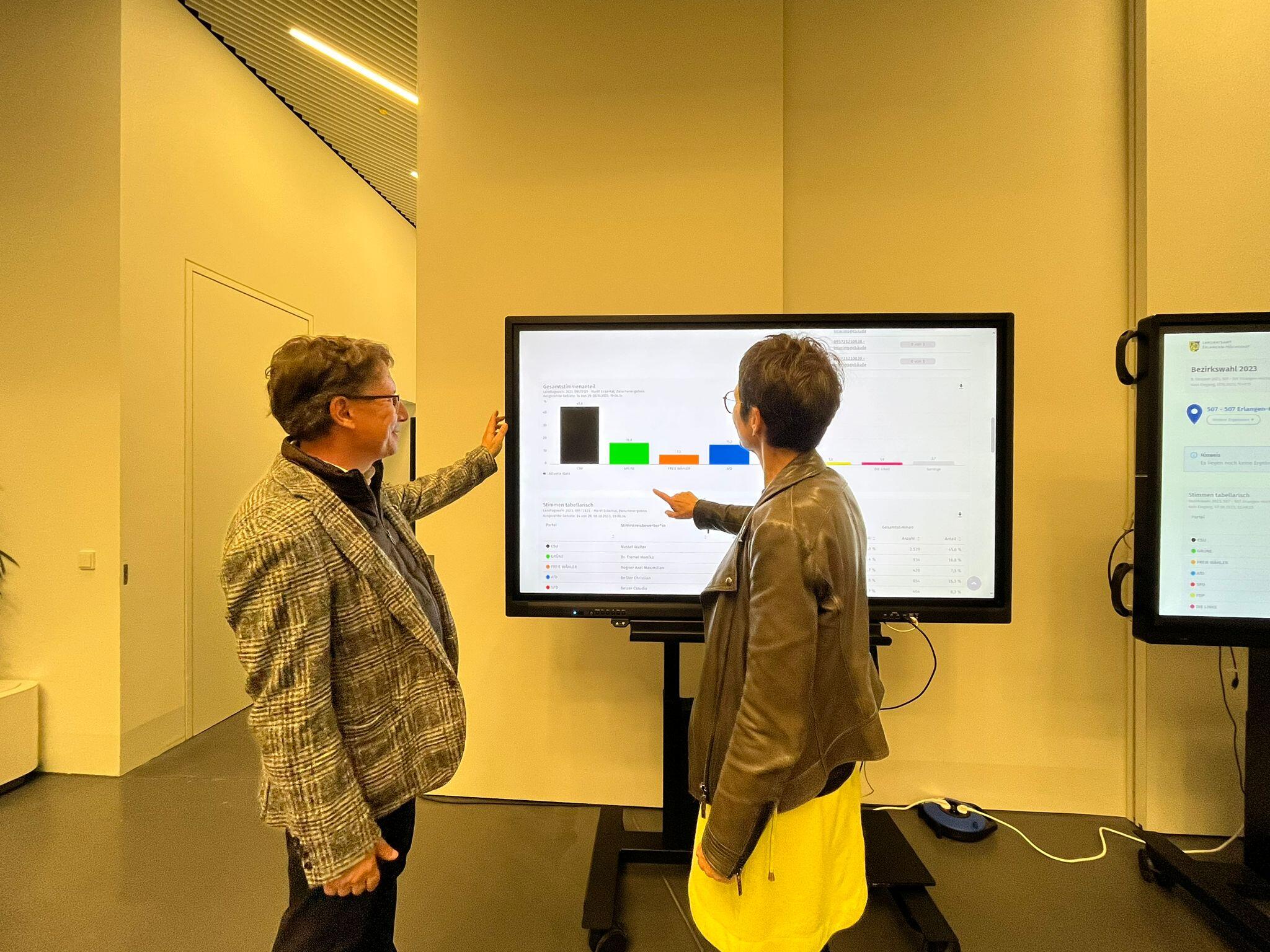 Zuletzt aktualisiert: 09.10.2023, 09:46 Uhr Landtagswahl in Erlangen-Höchstadt - zum Nachlesen Wer gewinnt die Wahl, welche Kandidaten und Parteien überraschen? Alle News und Hintergründe aus dem Stimmkreis Erlangen-Höchstadt (507) zur Landtagswahl 2023 am 8. Oktober finden Sie in unserem Liveticker. 1 2 3 09.10.2023, 13:02:53 Uhr So hat der Stimmkreis ERH abgestimmt 09.10.2023, 10:13:00 Uhr 09.10.2023, 10:12:00 Uhr 09.10.2023, 10:11:00 Uhr Bürgerentscheid in Herzogenaurach: Die Südumfahrung ist abgelehnt 09.10.2023, 10:10:00 Uhr Walter Nussel verteidigt Landtagsmandat Mit deutlichem Vorsprung verteidigt Walter Nussel (CSU) erneut sein Mandat. Der Jubel in seiner Scheune in Burgstall bleibt jedoch aus – das liegt unter anderem am Erstarken der AfD. 09.10.2023, 10:05:00 Uhr Walter Nussel (CSU): Die Dinge einfach regeln Porträt Der Herzogenauracher Walter Nussel von der CSU ist seit 2013 gewählter Direktkandidat aus dem Stimmkreis Erlangen-Höchstadt. 09.10.2023, 10:00:00 Uhr Porträt Joachim Herrmann (CSU): Der Unantastbare Porträt Der Bayerische Innenminister Joachim Herrmann geht als Direktkandidat der CSU im Stimmkreis Erlangen-Stadt an den Start. Zudem belegt er nach Ministerpräsident Markus Söder Platz zwei auf der Liste der CSU in Mittelfranken. 08.10.2023, 22:02:50 Uhr Das vorläufige Endergebnis in Erlangen Zum Endergebnis bei den Erststimmen im Stimmkreis Erlangen-Stadt eine Pressemitteilung aus dem Erlanger Rathaus: Am 8. Oktober wurde gewählt. Joachim Herrmann hat bei der Landtagswahl das Direktmandat errungen. Die Wahlbeteiligung betrug 74,3 Prozent. Joachim Herrmann hat bei der Landtagswahl am Sonntag erneut das Direktmandat im Stimmkreis 508 Erlangen-Stadt, zu dem auch die Gemeinden Heroldsberg und Möhrendorf gehören, errungen. Stimmkreisleiter Thomas Ternes gab dieses vorläufige Ergebnis auf der Grundlage der Schnellmeldungen um 20:55 Uhr bekannt. Der Christsoziale Herrmann kam am Abend auf 22.876 Erststimmen (36,6 %, 2018: 32,46 %). Sein stärkster Verfolger Christian Zwanziger (Bündnis 90/Die Grünen) erreichte 17.864 Stimmen (28,6 %, 2018: 26,01%). Für die anderen Bewerberinnen und Bewerber (Nennung in der Reihenfolge des Stimmzettels) lauten nach dieser vorläufigen Zählung die Ergebnisse wie folgt: Anette Wirth-Hücking (Freie Wähler): 3.040 Stimmen (4,9 Prozent), Dr. Joachim Schadel (AfD): 5.366 Stimmen (8,6 Prozent), Dr. Philipp Dees (SPD): 6.741 Stimmen (10,8 Prozent), Matthias Fischbach (FDP): 2.215 Stimmen (3,5 Prozent), Lukas Eitel (Die Linke): 1.753 Stimmen (2,8 Prozent), Christian Denzler (BP): 219 Stimmen (0,4 Prozent), Joachim Jarosch (ÖDP): 1.319 Stimmen (2,1 Prozent), Thomas Lehmann (Partei der Humanisten, PdH): 543 Stimmen (0,9 Prozent), Wolfgang Bosswick (dieBasis): 498 Stimmen (0,8 Prozent). Das Wahlergebnis bei den Gesamtstimmen (Erst- und Zweitstimmen addiert): CSU: 45.483 Stimmen (36,4 Prozent), Bündnis 90/Die Grünen: 35.195 Stimmen (28,2 Prozent), Freie Wähler: 6.216 Stimmen (5,0 Prozent), AfD: 10.573 Stimmen (8,5 Prozent), SPD: 13.806 Stimmen (11,0 Prozent), FDP: 4.362 Stimmen (3,5 Prozent), Die Linke: 3.654 Stimmen (2,9 Prozent), BP: 390 Stimmen (0,3 Prozent), ÖDP: 2.747 Stimmen (2,2 Prozent), Partei Mensch Umwelt Tierschutz: 567 Stimmen (0,5 Prozent), Partei der Humanisten (PdH): 1.019 Stimmen (0,8 Prozent), Basisdemokratische Partei Deutschlands (dieBasis): 1.008 Stimmen (0,8 Prozent). Die Wahlbeteiligung betrug 74,3 Prozent (2018: 67,8 Prozent). 85.832 Frauen und Männer waren aufgerufen, ihre Stimme abzugeben (Erlangen-Stadt: 75.860, Heroldsberg 6.279, Möhrendorf 3.693). 08.10.2023, 21:38:37 Uhr ERH: Vorläufiges Gesamtstimmenergebnis CSU: 42,3 Prozent Grüne: 16,5 Prozent AfD: 12,9 Prozent Freie Wähler: 10,6 Prozent SPD: 9,9 Prozent FDP: 2,5 Prozent Linke: 1,6 Prozent Sonstige: 3,7 Prozent Wahlbeteiligung: 77 Prozent 08.10.2023, 21:35:49 Uhr ERH: Das vorläufige Endergebnis bei den Zweitstimmen CSU: 46,1 Prozent Grüne: 16,4 Prozent AfD: 12,1 Prozent Freie Wähler: 8,9 Prozent SPD: 8,5 Prozent FDP: 2,5 Prozent Linke: 1,5 Prozent Sonstige: 4,0 Prozent Wahlbeteiligung: 77 Prozent 08.10.2023, 21:32:15 Uhr ERH: Das vorläufige Endergebnis bei den Erststimmen Walter Nussel(CSU) 38,5 Prozent Monika Tremel (Grüne): 16,5 Prozent Christian Beßler (AfD): 13,8 Prozent Axel Rogner (Freie Wähler): 12,3 Prozent Claudia Belzer (SPD): 11,3 Prozent Boulent Ekrem (FDP): 2,5 Prozent Josephine Taucher (Linke): 1,7 Prozent Manfred Reinhart (ÖDP): 1,7 Prozent Daniela Pülhorn (dieBasis): 1,0 Prozent Beate Haskic (BP): 0,7 Prozent Ungültige Stimmen: 0,7 Prozent Wahlbeteiligung: 77 Prozent 08.10.2023, 21:22:20 Uhr Am späteren Abend: Nachbesprechung der SPD in Erlangen, die Stimmung ist gedämpft, der Blick auf die Smartphones mit den Ergebnissen geheftet. Die Genossen machen gute Miene zum bösen Spiel. 08.10.2023, 21:21:00 Uhr Thema Südumfahrung fordert die Bürger erneut Der Wahlsonntag ist für die Herzogenauracher noch aus weiterer Hinsicht spannend: Stand doch auch der Bürgerentscheid zur Südumfahrung an. Bis 18 Uhr hatten auch hierfür die Wahllokale geöffnet, ein Ergebnis allerdings ist noch nicht zu erwarten. Die Auszählung des Bürgerentscheids erfolgt erst nach den beiden Wahlen und ist vermutlich erst nach Mitternacht beendet, sagte Wahlleiter Gerd Lorenz vor wenigen Tagen. Lesen Sie in unserem Artikel die unterschiedlichen Positionen, die zum Entscheid anstanden. 08.10.2023, 21:14:45 Uhr Herrmann gewinnt in Erlangen Im Stimmkreis Erlangen-Stadt hat sich am Wahlabend ein ähnliches Bild wie im Stimmkreis Erlangen-Höchstadt abgezeichnet. Joachim Herrmann, Direktkandidat der CSU und Innenminister des Freistaats, lag um 20.30 Uhr mit 36,7 Prozent der Erststimmen vor seinen Konkurrenten. Da waren 166 von 170 Wahllokale ausgezählt. Damit fuhr der Landtagsabgeordnete ein ähnliches Ergebnis wie sein Parteikollege Walter Nussel in Erlangen-Höchstadt ein. Die Bewerber der anderen bislang im Landtags vertretenen Parteien sc