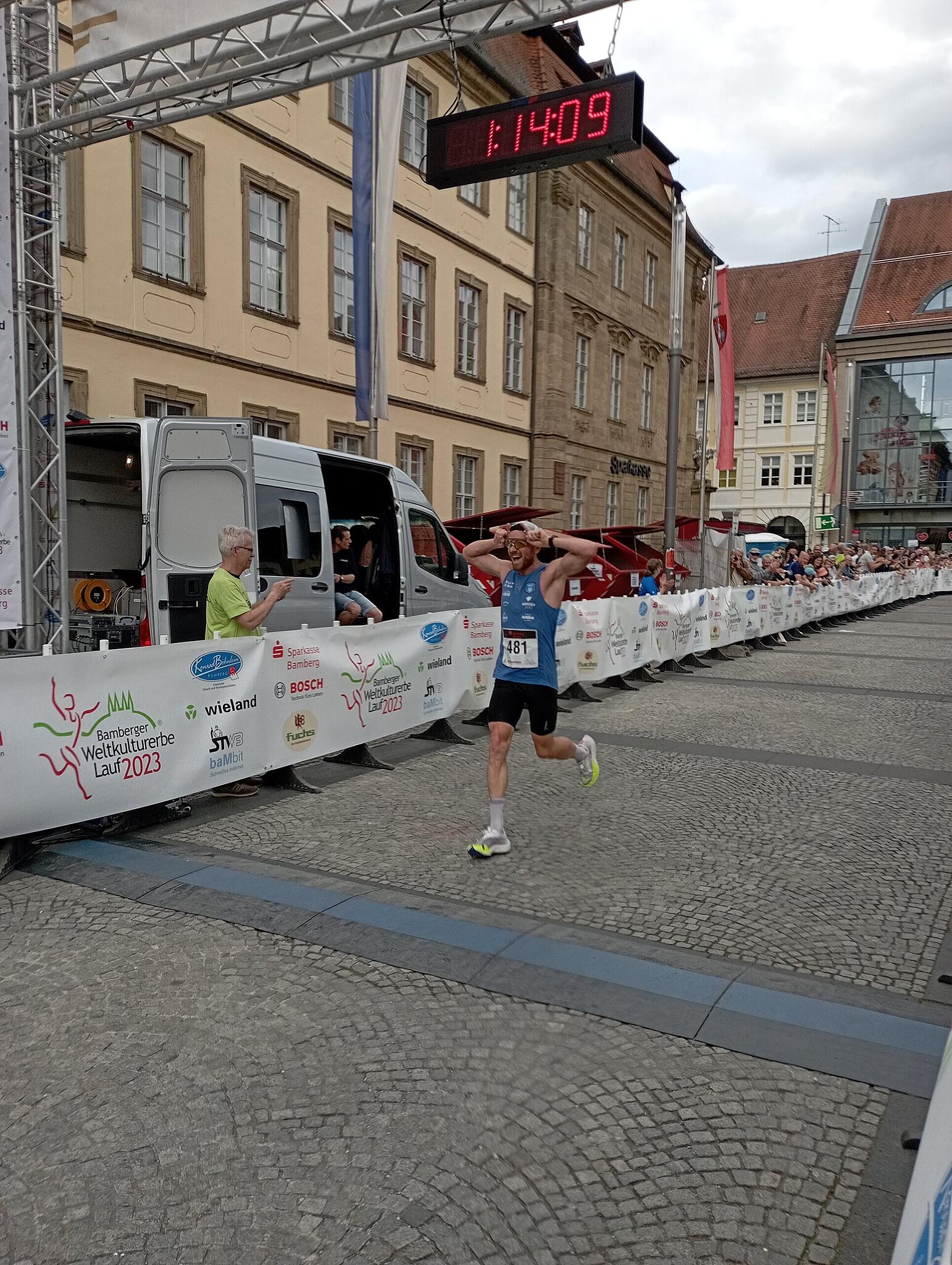 Zuletzt aktualisiert: 04.10.2023, 18:08 Uhr Liveticker zum Nachlesen: Das war der Bamberger Weltkulturerbelauf 2023 Einen Tag lang haben die Reporterinnen und Reporter des Fränkischen Tags live aus der Bamberger Altstadt berichtet. Die Impressionen einer glanzvollen Sporttags können Sie in unserem Liveticker nachlesen. 1 2 3 4 5 07.05.2023, 19:31:07 Uhr Weltkulturerbelauf: Bamberg rennt, Bamberg siegt Eine Minute an der Sensation vorbei - das war der Weltkulturerbelauf aus sportlicher Sicht Im Brose-Lauf über 10,7 Kilometer sind gleich drei Frauen schneller gelaufen, als die bisherige Bestmarke. Das waren die sportlichen Höhepunkte. #plus 07.05.2023, 19:20:27 Uhr Noch viel mehr Bilder vom Weltkulturerbelauf Bamberg Weltkulturerbelauf 2023: Die Bilder des Tages Von den Bambinis bis zum Halbmarathon: Das sind die Bilder vom zehnten Weltkulturerbelauf von unseren Fotografen Ronald Rinklef und Helmut Ölschlegel. #plus 07.05.2023, 19:02:01 Uhr So war der Weltkulturerbelauf 2023 in Bamberg Zusammenfassung: Die Eindrücke vom zehnten Weltkulturerbelauf Tausende Läuferinnen und Läufer, ausgelassene Stimmung: So war der Weltkulturerbelauf 2023. #plus 07.05.2023, 18:42:24 Uhr Finale: Der zehnte Weltkulturerbelauf geht zuende Die Straßenreiniger drehen ihre Runden und die Polizei beendet auch allmählich ihren Dienst. Der zehnte Weltkulturerbelauf in Bamberg ist beinahe vorbei. Auch wir verabschieden uns von der Live-Berichterstattung - nicht ohne darauf hinzuweisen, dass es sich lohnt bis morgen Nachmittag noch einmal in den Liveticker zu schauen. Es folgen Bildergalerien unserer Fotografen und Nachberichte eines ereignisreichen Stadtlaufs. Wir sagen noch einmal Danke an alle, die das Sportereignis unterstützt haben und verabschieden uns in den Feierabend. 07.05.2023, 18:15:17 Uhr Aus den Highlands nach Bamberg? Connor MacLeod oder ein anderer schottischer Hochlandsportler? An Kostümierungen hat es auch beim Weltkulturerbelauf 2023 nicht gemangelt. 07.05.2023, 18:02:43 Uhr Auch die Müllabfuhr hat die Strecke gesichert Zum Abschluss noch ein paar Impressionen neben der Strecke des Weltkulturerbelaufs: Unter anderem ein Wagen der Müllabfuhr ist als mobile Straßensperre im Einsatz. Für zwei Kollegen, die seit 11 Uhr im Dienst sind, mal eine andere Art von Arbeit. An anderen Stellen seien Kanal- und Straßenbau-Fahrzeuge abgestellt, berichtet der Kollege der Müllabfuhr. 07.05.2023, 17:49:54 Uhr Liebe Leserinnen und Leser, wir sagen schon jetzt... ...danke fürs Verfolgen des Livetickers! Es ist noch nicht zu Ende, aber die gesamte FT-Redaktion hofft, dass euch der Tag mit uns so viel Freude bereitet hat, wie uns das Tickern. Besonderer Dank geht an unsere eifrigen Fotografen, die neben den Reporterinnen und Reportern uns Fotos und Videos vom Streckenrand zugeschickt haben: Danke Christin Frisch, David Maier und allen, die unseren Hashtag #wkel23 genutzt haben! 07.05.2023, 17:44:14 Uhr Welterbelauf statt Kirche: Schwestern kommen nicht mit dem Auto weg Während die Läufer nach und nach im Ziel ankommen, noch ein Blick an den Streckenrand am Wettkampftag: Eigentlich wollten Schwester Beate (links im Bild) und Schwester Edith aus der Institutskirche zu einem Konzert in Stegaurach fahren. Doch ihr Auto parkt an einer Stelle, wo es aufgrund des Weltkulturerbelaufs aktuell nicht raus darf. Alternativprogramm: Zuschauen am Streckenrand und Hoffen, den emeritierten Erzbischof Ludwig Schick zu sehen. Der ist mit den anderen Teilnehmern des 4,4-Kilometer-Laufs zu diesem Zeitpunkt allerdings schon vorbei. 07.05.2023, 17:27:56 Uhr #wkel23: Neues von den Schafen Wen noch interessiert, wer noch auf der Schafsweide der Kamerun-Ottos steckt, hier ist die Antwort. So wird beim Weltkulturerbelauf richtig gejubelt. Teilt gerne weiter eure Impressionen von und neben der Strecke. #wkel23 07.05.2023, 17:20:23 Uhr Zwei Feuerwehrmänner rennen im Atemschutzanzug Laufen mit Atemschutz: Das steckt hinter der Aktion Zwei Feuerwehr-Männer aus Altendorf waren knapp elf Kilometer nicht genug. Mit Atemmaske standen sie am Start. Was sich hinter der Aktion verbirgt, hat FT-Reporter Sebastian Schanz herausgefunden. #plus 07.05.2023, 17:17:27 Uhr Endspurt: Domberg abwärts und ins Ziel! Vorbei am Dom und dann ab Richtung Maxplatz. Die Läuferinnen und Läufer mobilisieren im Endspurt die letzten Kräfte auf einem der anspruchsvollsten Halbmarathons in Deutschland. Auf geht's in den Endspurt! 07.05.2023, 17:02:48 Uhr LG Bamberg jubelt! Schnellste Frau läuft auch für den Verein Ein Verein jubelt heute Abend besonders: Die Leichtathletikgemeinschaft Bamberg hat allen Grund zu feiern. Nicht nur Gabriel Lautenschlager holt den Titel im Sparkassen-Lauf bei den Männern. Schnellste Frau wird mit 1:25:20 Ingalena Schömburg-Heuck, ebenfalls von der LG Bamberg. Der Streckenrekord bleibt aber der bisherige aus dem Jahr 2019: Brendah Kebeya hat die 21,1 Kilometer vor vier Jahren in 1:18:09 geschafft. 07.05.2023, 16:58:26 Uhr Elf Sekunden! Christopher Dels vor Jonas Lehmann Jonas Lehmann kann den Titel im Halbmarathon nicht verteidigen. Das Triple ist damit Geschichte. Christopher Dels (Bild) landet mit einem hauchdünnen Vorsprung von elf Sekunden (1:14:10) auf dem zweiten Platz . 07.05.2023, 16:54:43 Uhr Das Siegerbild: Gabriel Lautenschlager beim Zieleinlauf Mit 1:11:33 verpasst Gabriel Lautenschlager nur um eine Minute den Streckenrekord des britischen Läufers Daren Deed aus dem Jahr 2013. Ein fantastischer Lauf! 07.05.2023, 16:49:49 Uhr Kurz vor der Ziellinie: Gabriel Lautenschlager gewinnt Halbmarathon! In 1:11:33 hat es der Läufer der LG Bamberg ins Ziel am Maxplatz geschafft. Damit verweist er Christopher Dels und Jonas Lehmann auf die Plätze 2 und 3 mit knapp drei Minuten Vorsprung. 07.05.2023, 16:43:50 Uhr Gabriel Lautenschlager gewinnt den Halbmarathon! Er hat es geschafft: Gabriel Lautenschlager von der LG Bamberg gewinnt in 1:11:33 Stunde den Sparkassen-Lauf auf Halbmarathon-Distanz! 07.05.2023, 16:31:44 Uhr Gle