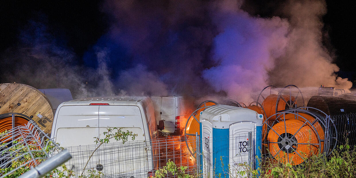 Nach derzeitigem Stand brannten fünf Transporter, ein Lkw und zwei Mini-Bagger komplett aus. Den Schaden beziffert die Polizei aktuell auf einen mittleren sechsstelligen Bereich. Die Hintergründe zu dem Brandanschlag sind momentan noch völlig unklar. Verletzt wurde zum Glück niemand.