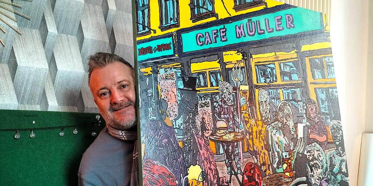 – Markus Heger spielt in seiner Kunst mit Heimat und Humor. Da treibt der Gablmoo schon mal Wassersport auf der Regnitz. Und im neuesten Werk trifft sich die ganze Bamberg-Prominenz in der Austraße.